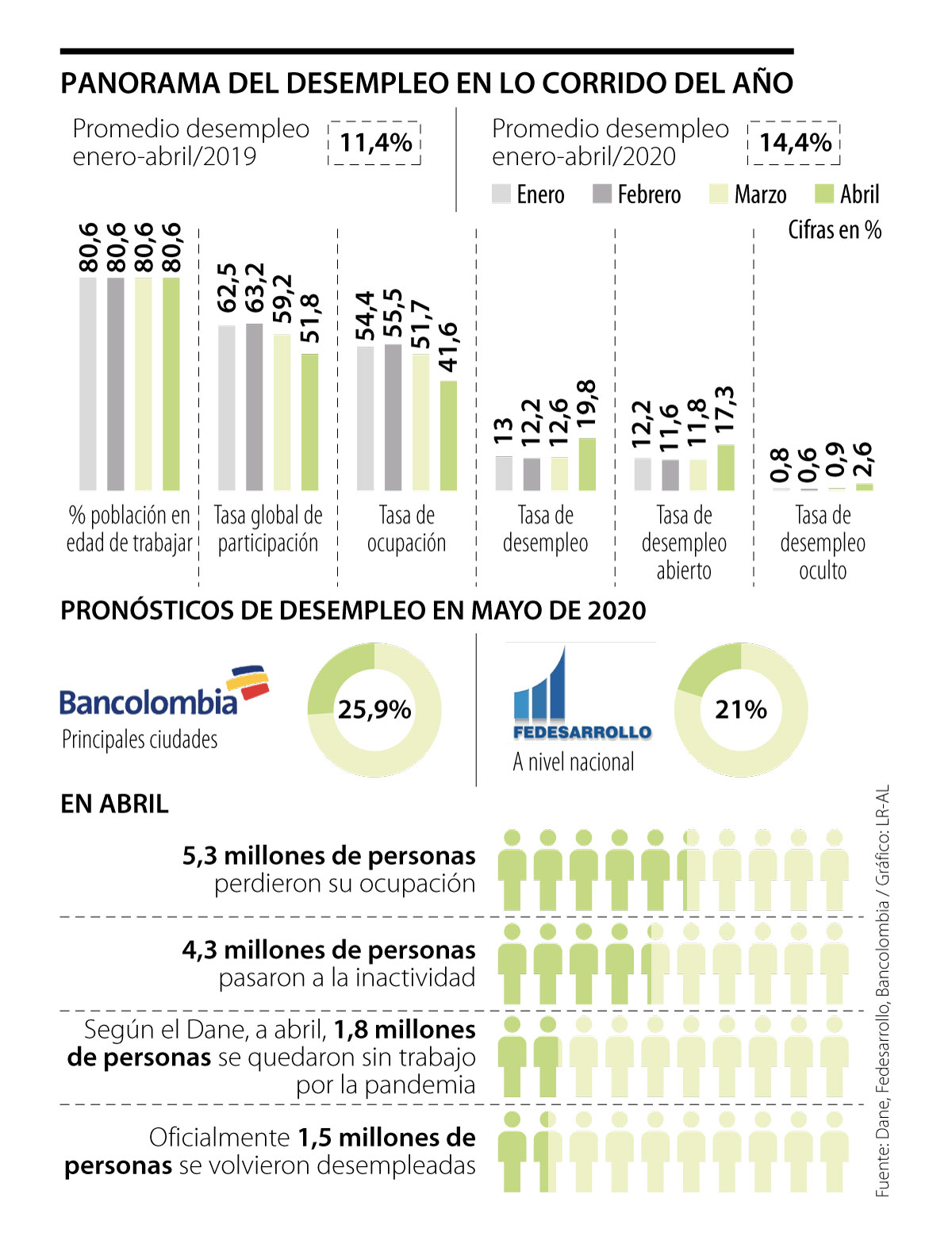 El desempleo en el primer semestre del año se encamina a ser el peor de la historia reciente del país, tras acumular un promedio entre enero y abril de 14,4%, impulsado por un récord de 19,8% en el cuarto mes. Además, hoy el Dane revelará el dato de mayo, el cual se prevé que ronde 20%.