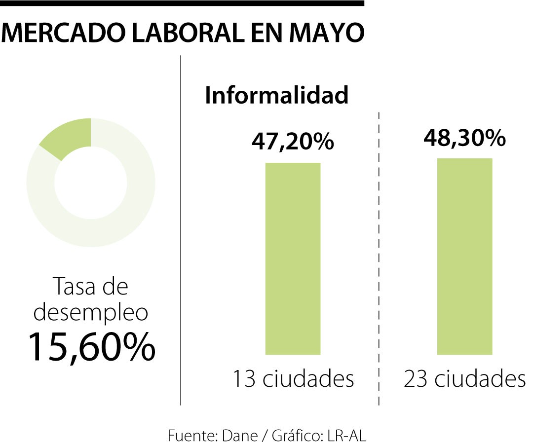 El Departamento Administrativo Nacional de Estadística (Dane) reveló que en marzo de 2022, la proporción de población ocupada informal en las 23 ciudades y áreas metropolitanas fue de 45,5%, mientras que para las 13 ciudades y áreas metropolitanas fue de 44,3%. De acuerdo con la entidad, la variación para este año llegó a -2,4 puntos porcentuales (pp) y -2,5 pp, respectivamente, teniendo en cuenta que frente al mismo mes de 2021, las proporciones en esta materia fueron de 47,9% y 46,8%, respectivamente.