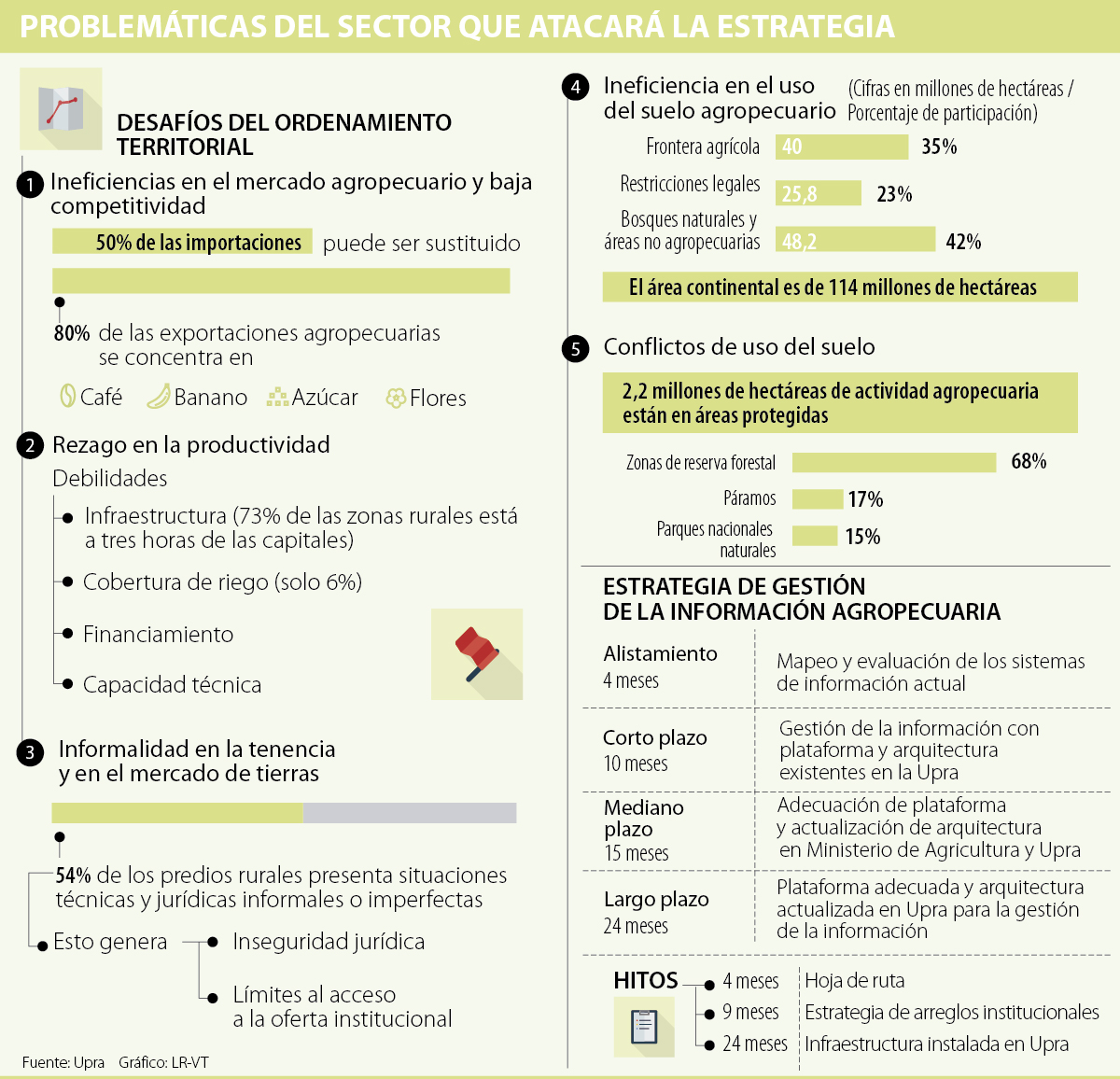 El director de la Upra, Felipe Fonseca, explicó que si bien, la estrategia de gestión de la información agropecuaria, hace más eficiente la recolección y organización de los datos del sector, su objetivo de fondo es atacar los cinco retos que hoy restan competitividad al agro. La lista está compuesta por desafíos como (1) ineficiencia en el mercado agropecuario y baja competitividad, (2) rezago en la productividad, (3) informalidad en la tenencia y en el mercado de tierras, (4) ineficiencia en el uso del suelo agropecuario y (5) conflictos de uso de suelo.