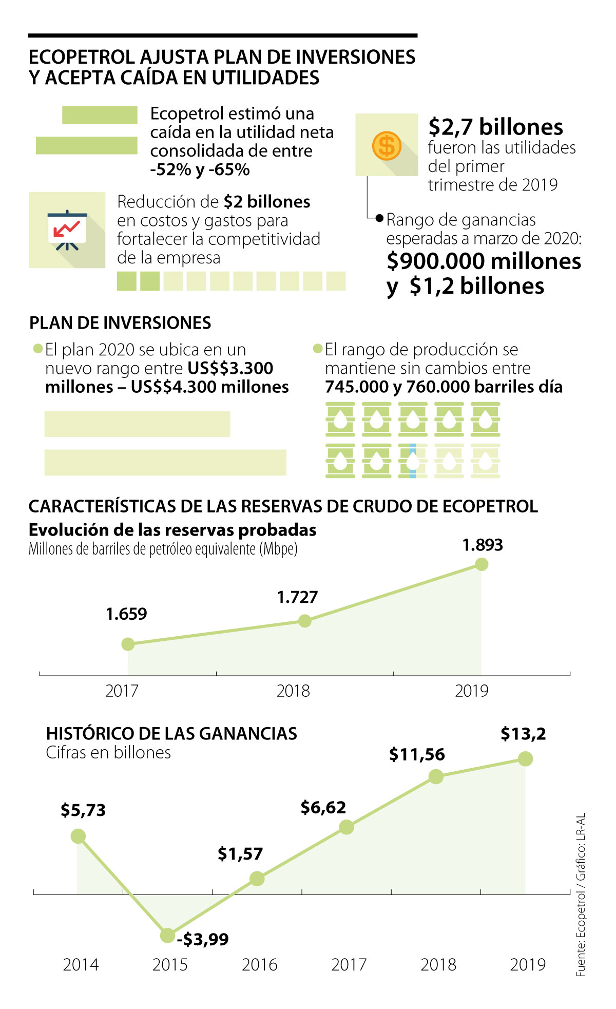 De acuerdo con su reporte financiero, en total, los ingresos consolidados llegaron a $15,07 billones, es decir, 5,5% menos que en el primer trimestre de 2019. En esa misma línea, la petrolera confirmó que su Ebitda se redujo a $5,3 billones, muy por debajo (-28,5%) de los $7,3 billones del año pasado.