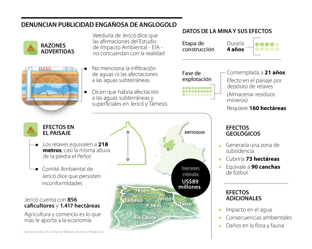 “¿En qué se basa la denuncia? En las declaraciones que se han hecho en publirreportajes que han sido presentados por AngloGold Ashanti en medios nacionales y locales. También en algunas socializaciones que han hecho en el pueblo. Estas afirmaciones las hemos confrontado con el EIA y encontramos que se distorsiona la información que se ha dado”, explicó Fernando Jaramillo, vocero de Veeduría de Jericó.