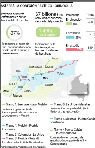 El Gobierno Nacional, junto a la Cámara Colombiana de la Infraestructura y ProPacífico presentaron oficialmente la vía que conectará al Pacífico con la Orinoquía. Se trata de un ambicioso proyecto que costará un poco más de $25,1 billones y que atravesará todo el país, desde Puerto Carreño hasta Buenaventura.