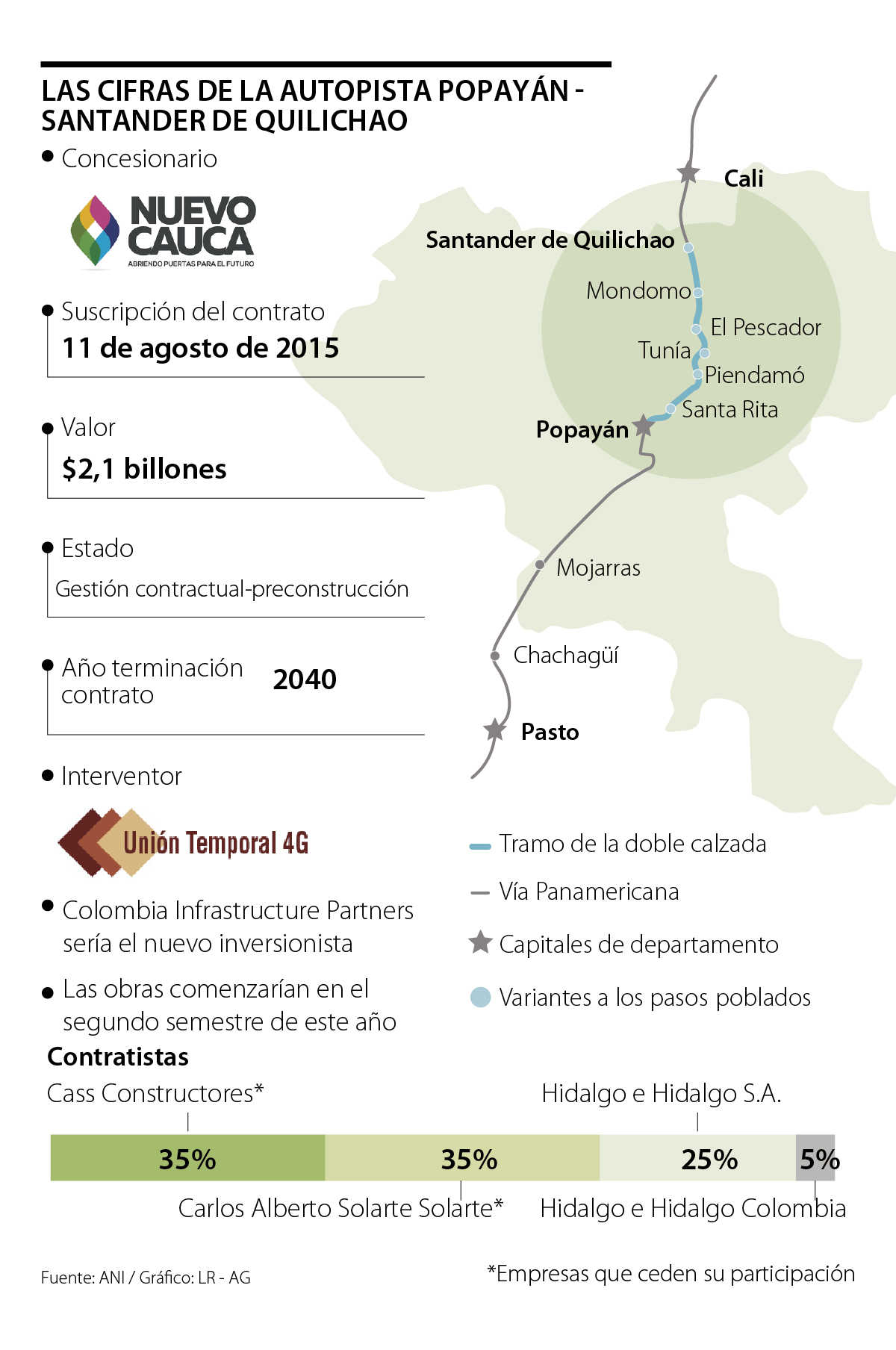 Jorge Libardo Duarte, gerente de la concesión Nuevo Cauca, explicó, igualmente, que la oferta vinculante de “Old Mutual no sería una compra, sino una cesión de acciones. Cederían las acciones del Grupo Solarte, para que ellos puedan ejecutar el proyecto. Hidalgo continuaría con Old Mutual. Eso estaría en septiembre”.