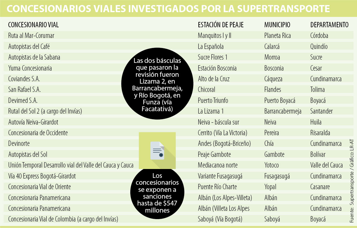 Sobre este último tema, la Superintendencia de Puertos y Transporte abrió investigación a 17 concesiones viales del país por errores en la construcción, instalación, mantenimiento y calibración de básculas camioneras.