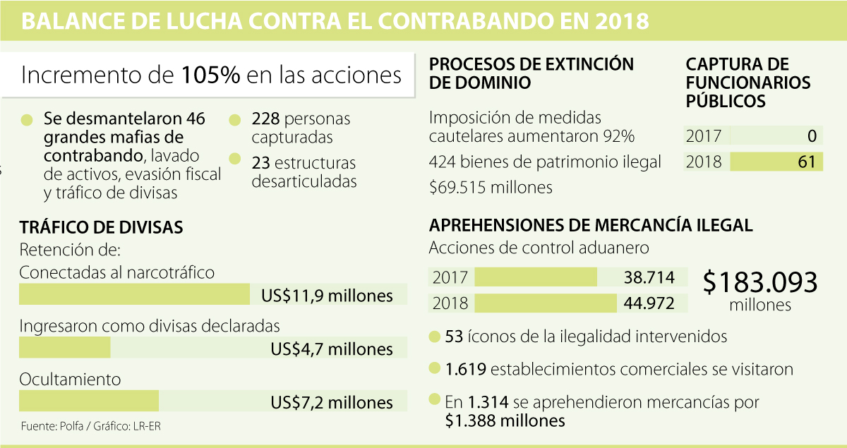 Este año se desmantelaron 46 grandes mafias de contrabando, lavado de activos, evasión fiscal y tráfico de divisas, lo que dejó un saldo de 228 personas capturadas, 123 registros de privaciones de libertad y 23 estructuras criminales desarticuladas.