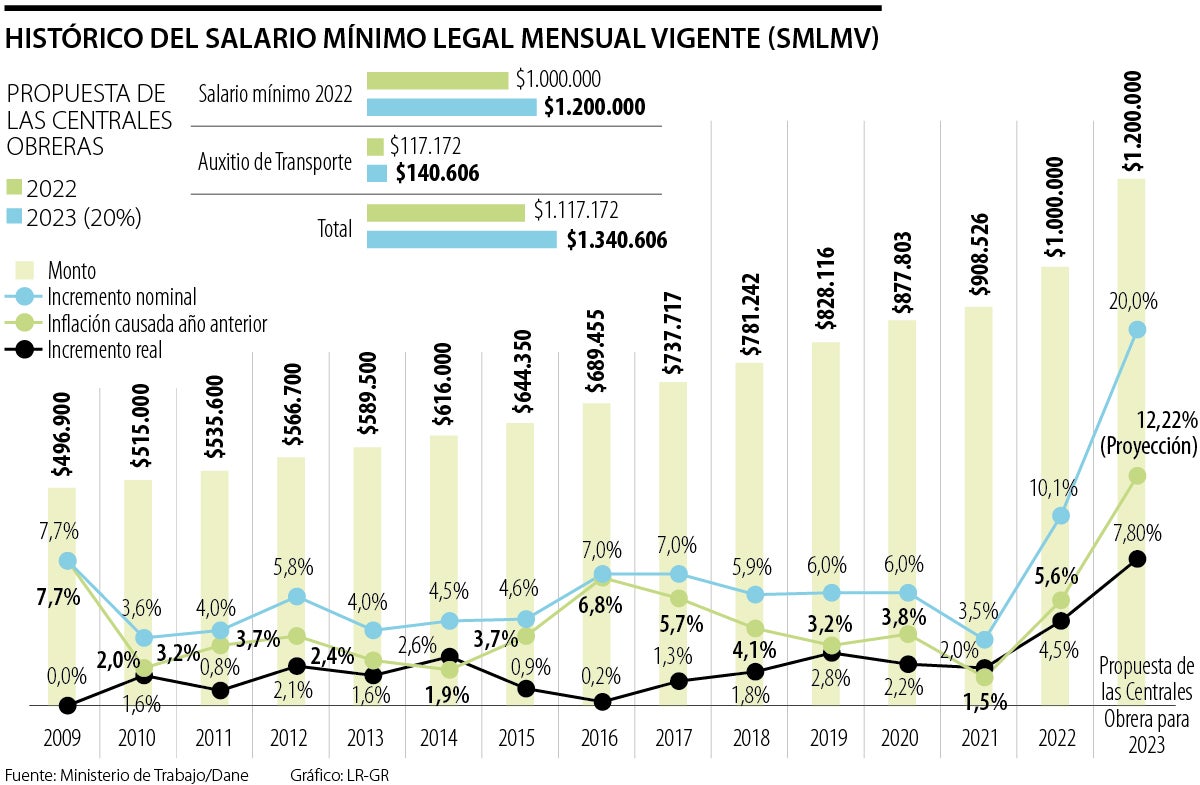 Las centrales obreras revelaron ayer su propuesta de 20% para el incremento del salario mínimo de 2023, con lo que el básico llegaría a $1,2 millones el próximo año.