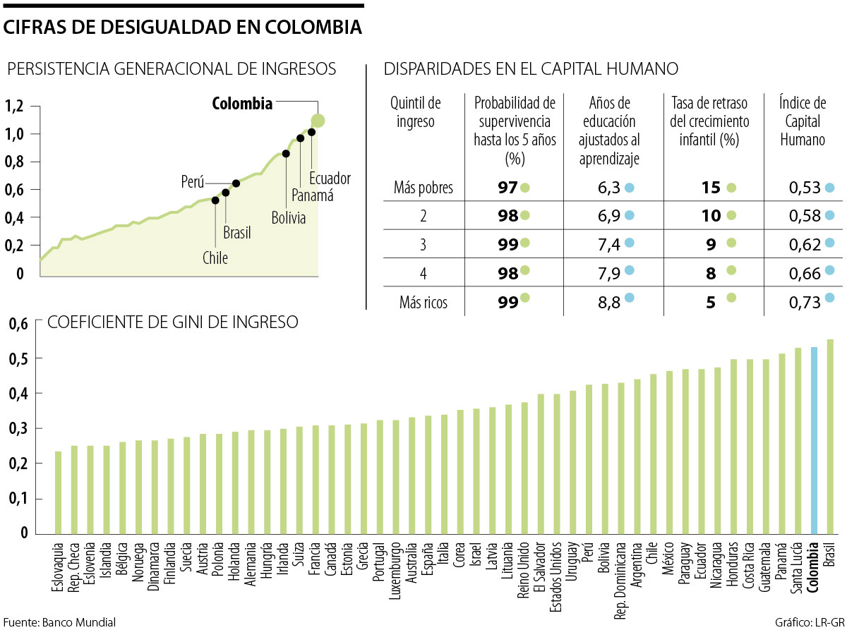 El estudio resaltó que Colombia tiene una de las tasas de persistencia de desigualdad más altas entre una generación y la siguiente. De hecho, se encontró que entre 75 países, Colombia es donde hay mayor persistencia de ingresos intergeneracional, es decir, los ingresos futuros de los hijos dependen de los ingresos de sus padres, por lo que la movilidad social es muy baja.