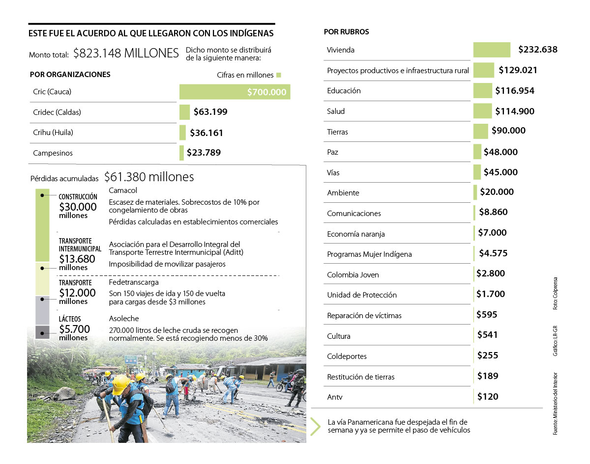 Luego de casi un mes en el que la minga indígena mantuvo paralizada la Vía Panamericana, que dejó afectaciones por más de $60.000 millones en los departamentos de Cauca y Nariño, el Gobierno y las comunidades llegaron a un acuerdo que compromete $823.000 millones y que permitió el fin de las protestas. De este dinero, según se desprende del acta final, $700.000 millones (85%) irán para el Consejo Regional Indígena del Cauca (Cric). En general, $232.683 millones (28,3%) irá para el sector vivienda, mientras que habrá $90.000 millones para comprar más tierras.