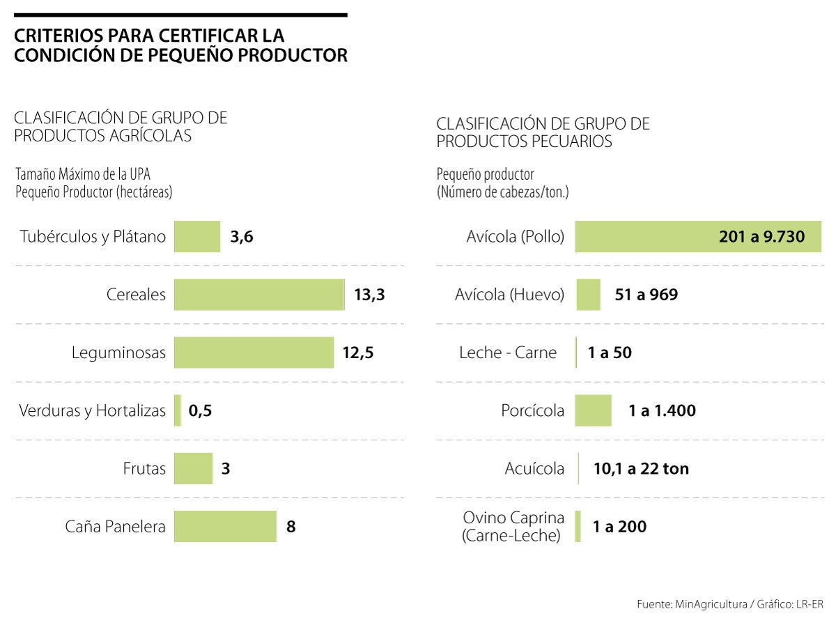El término ‘pequeño productor’ se definirá de manera técnica según lo reglamentado por la cartera. En el caso de los productores agrícolas entrarán en este rango los que su área no supere un predio de las siguientes medidas: De 0,5 hectáreas (ht) para las fincas de verduras y hortalizas; 3 ht en frutas, máximo de 3,6 ht para tubérculos y plátano; 8 ht para los de caña panelera; un tope de 12,5 ht con leguminosas, y de 13,6 ht para los de cereales.
