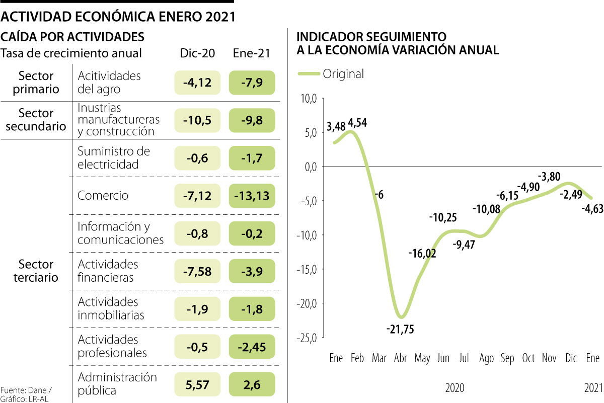 Esto lo corroboran las cifras y el último informe sobre el seguimiento a la economía que realiza el Dane, en el que se evidenció una caída anual en enero de 4,63%, en su serie original, y una caída mensual, en la serie corregida de 1,53% en la actividad económica del país.