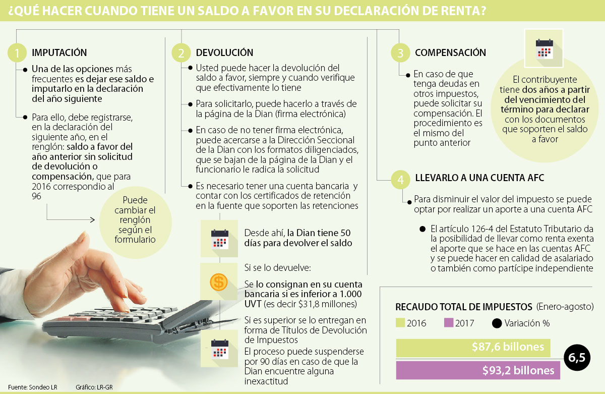 Una de las dudas más frecuentes después de presentar su declaración de renta es qué hacer con el saldo a favor, puesto que según la Dirección de Impuestos y Aduanas Nacionales (Dian) alrededor de 40% de quienes deben declarar renta queda con un superávit y en 2015 la entidad devolvió $500.000 millones a personas naturales.