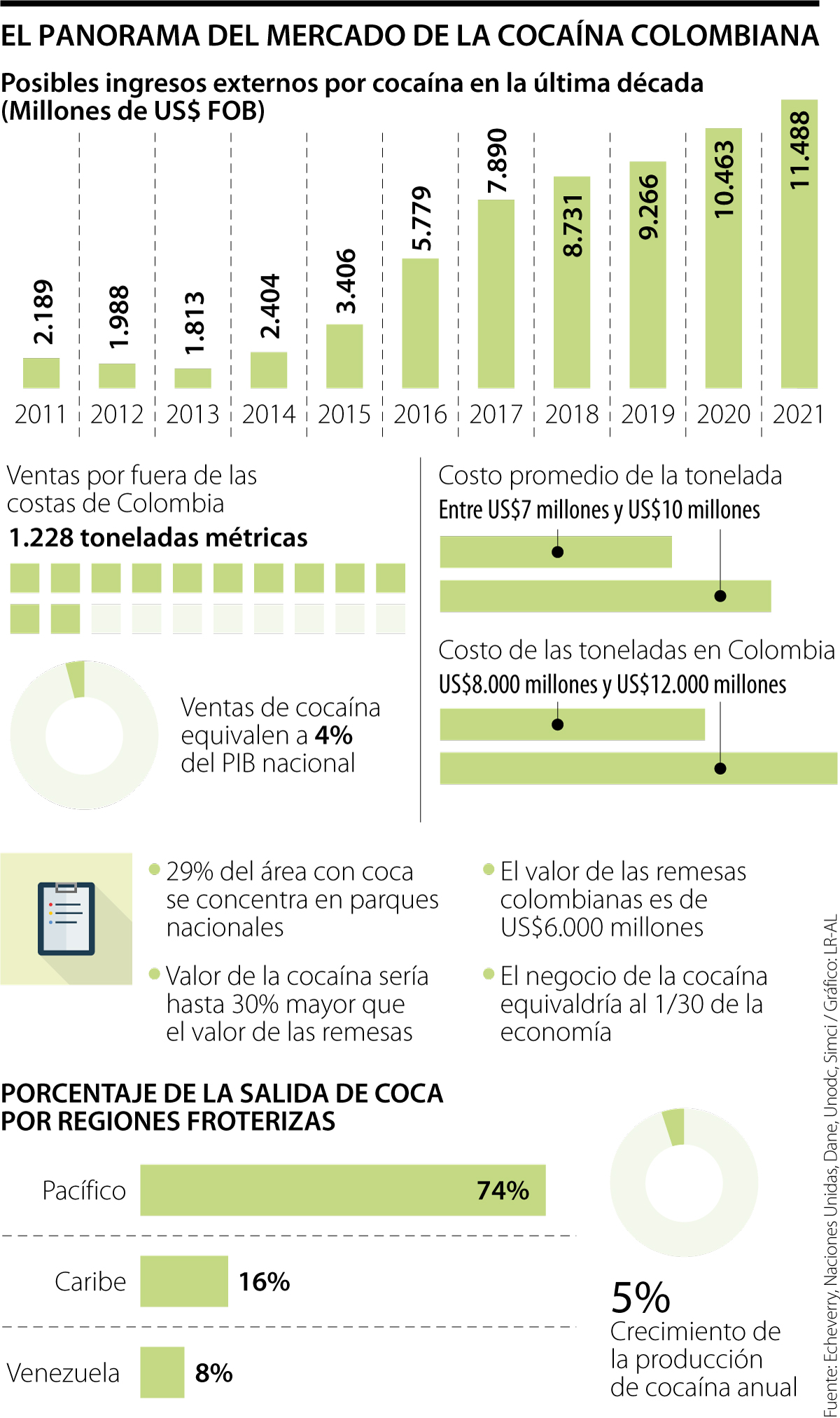 Desde la época del narcotráfico que vivió el país hace más de 25 años, las ventas al exterior de clorhidrato de cocaína nunca habían sido de magnitudes tan altas como las que se registran actualmente. Con un potencial de producción de cocaína de 1.228 toneladas, según las Naciones Unidas, los ingresos por la venta de este producto fluctuarían entre US$8.000 millones y US$12.000 millones.