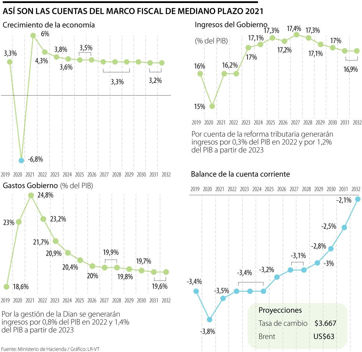 En las cuentas del Mfmp, que van hasta 2032, se espera que el petróleo Brent se cotice a US$63 el barril en 2021 y 2022. Además, este año el dólar estaría a $3.667, mientras que dentro de un año llegaría a $3.774. La inflación, por su parte, se ubicaría en 3% este año y en 2,8% en 2022, dentro del rango del Banco de la República.