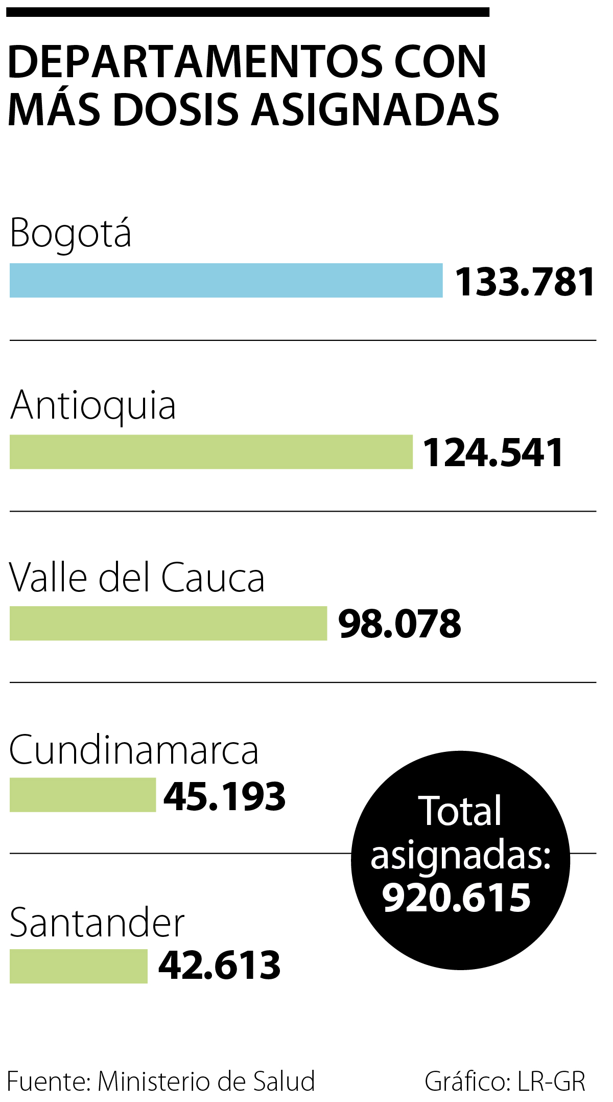 Estas son las dosis que recibirán algunos de los territorios, por ejemplo: a Amazonas llegarán 175; a Antioquia 123.541; a Bogotá 133.781; a Cundinamarca 56.193; a Santander 42.613 y a Valle del Cauca le mandarán 98.079.