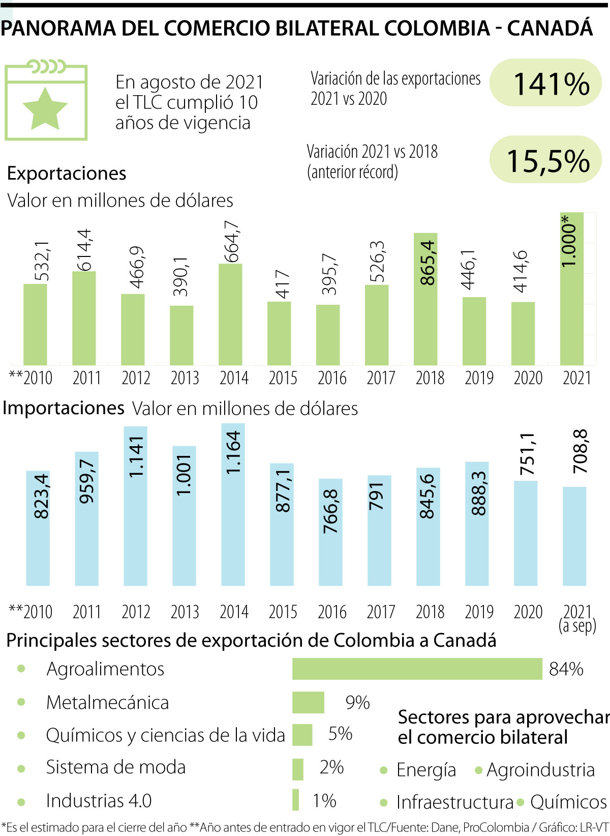 Luego de diez años de entrado en vigencia el Tratado de Libre Comercio entre Canadá y Colombia, este 2021 será el mejor de las relaciones comerciales entre ambos países y Colombia alcanzaría máximo histórico en las exportaciones llegando a los US$1.000 millones, lo que representaría un crecimiento de más de 140% frente al nivel de 2020 cuando llegaron a US$414,6 millones.