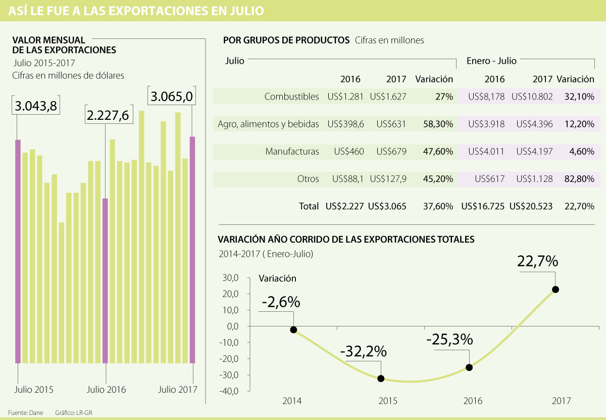 El comercio exterior no perdió la buena marcha de la primera mitad del año y completó en julio un crecimiento de 37,6%, representado en ventas al resto del mundo por US$3.065 millones. Este es un resultado importante si se tiene en cuenta que, entre enero y julio de 2016, las exportaciones se desplomaron 25,3%, por múltiples efectos externos.