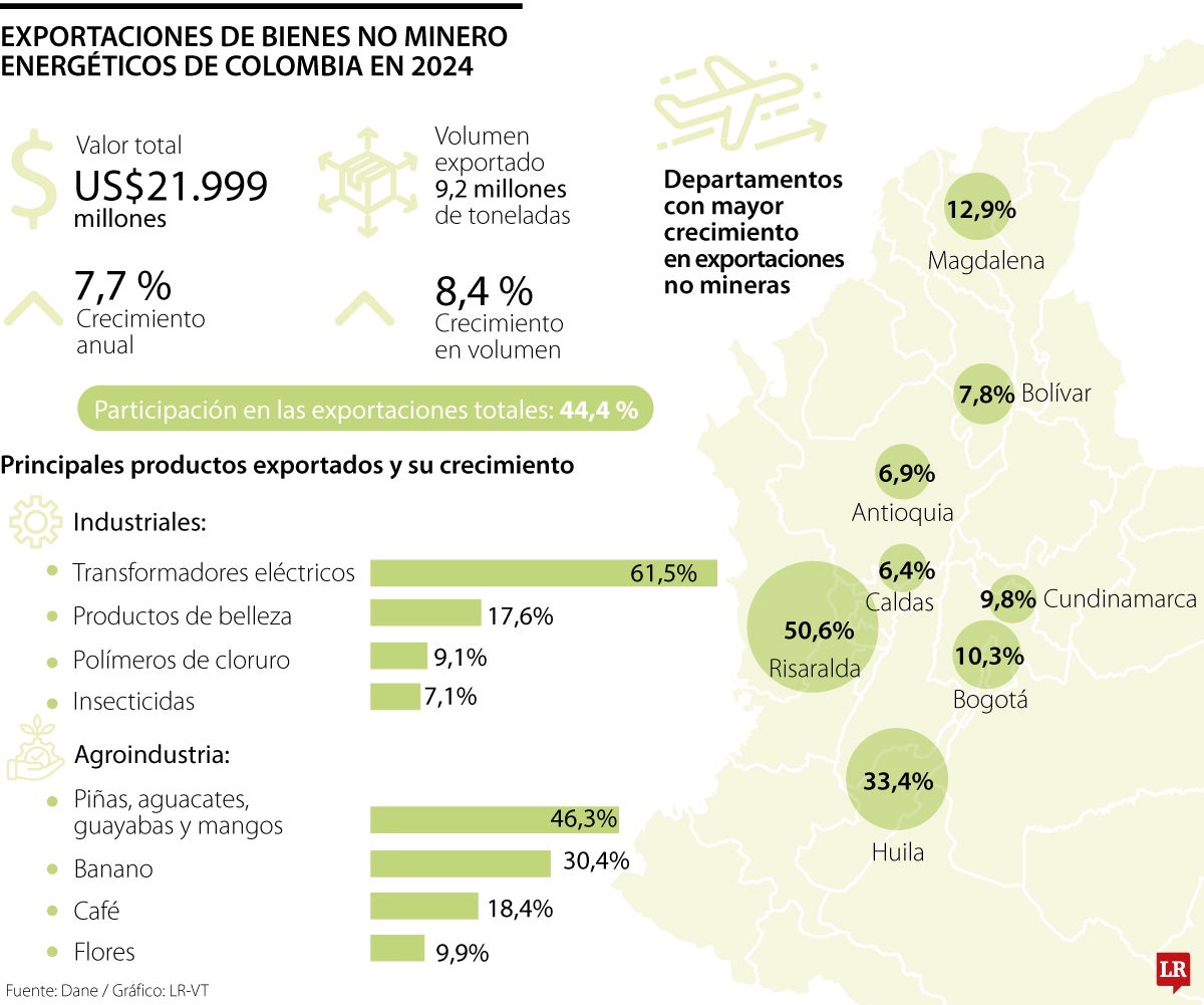 Las exportaciones de bienes no minero energéticos de Colombia alcanzaron US$21.999 millones durante el año pasado, lo que representó un crecimiento de 7,7% en términos reales frente a 2023.