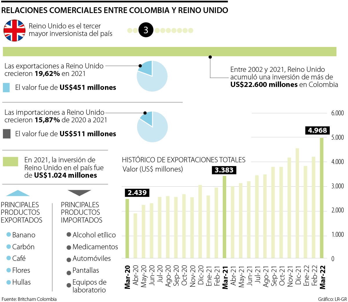 En cuanto a exportaciones, González afirmó que el año pasado los productos que salieron de Colombia a Reino Unido crecieron 19,62%, si se toma como referencia el año inmediatamente anterior. El valor de los productos fue de US$451 millones. Las importaciones también tuvieron un incremento de 15,87% y dio como resultado un valor comercial de US$511 millones.