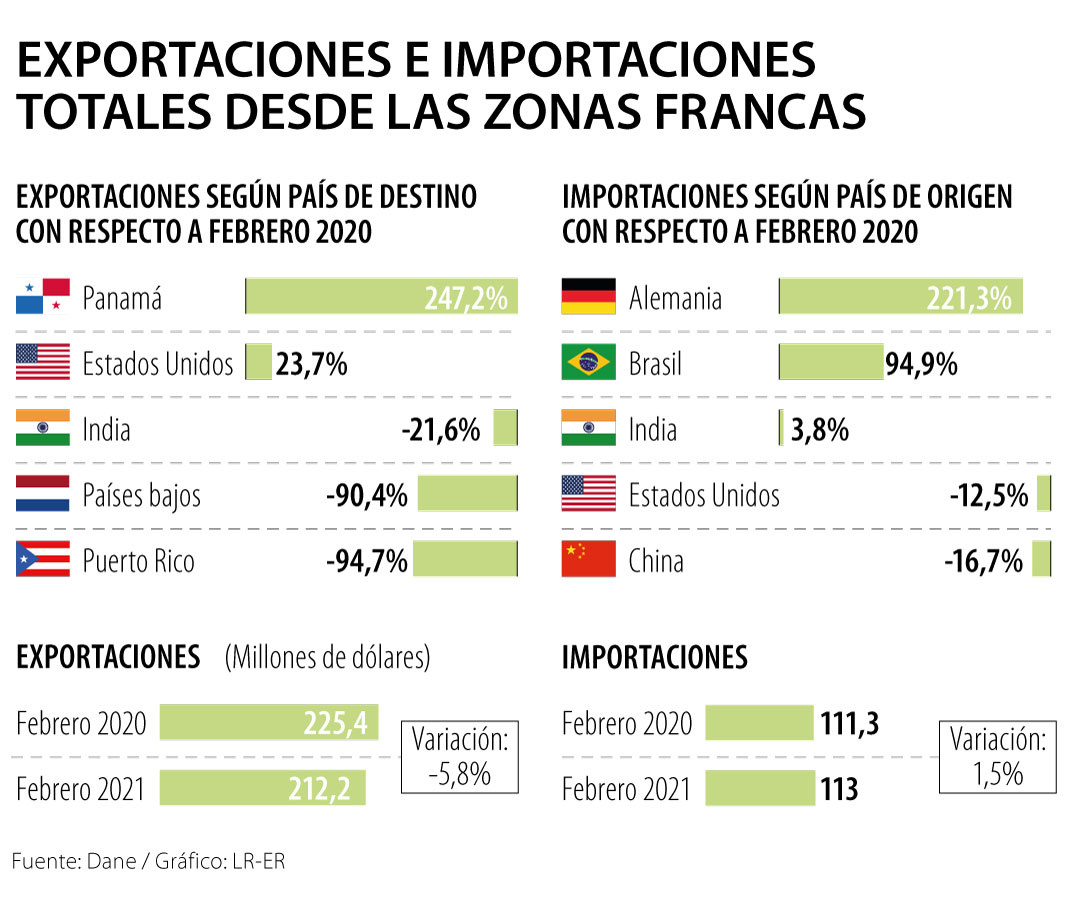 Por otro lado, en el segundo mes del año, las importaciones desde las zonas francas aumentaron 1,5%, pues pasaron de US$111,3 millones en febrero de 2020 a US$113,0 millones en el mismo mes de 2021.