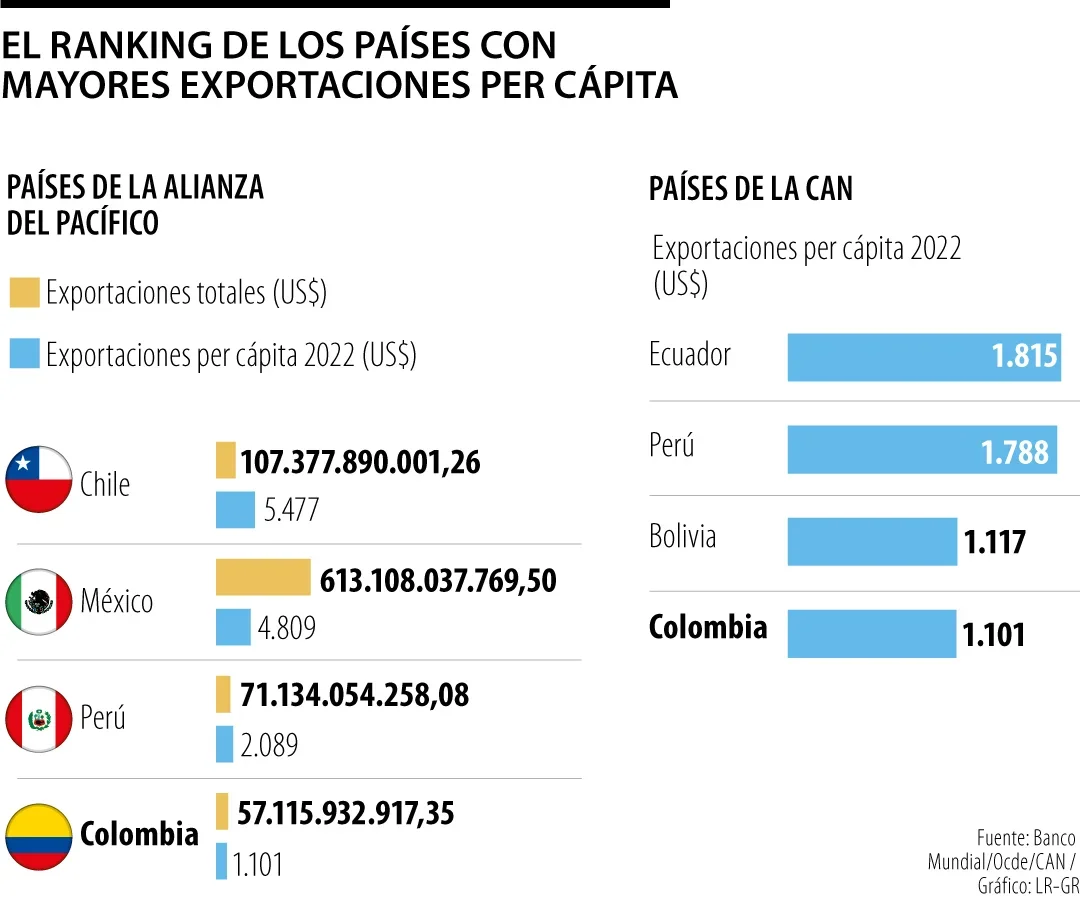 En esta lista, Colombia, como se mencionó, figura en la última casilla. Las exportaciones per cápita del país en un año como 2022 fueron de US$1.101, según el promedio con datos del Banco Mundial. Como hallazgo, según Sebastián Trujillo, experto en temas Ocde. Colombia es entonces el país del boque con menor desarrollo exportador comparado en relación a la cantidad de habitantes.
