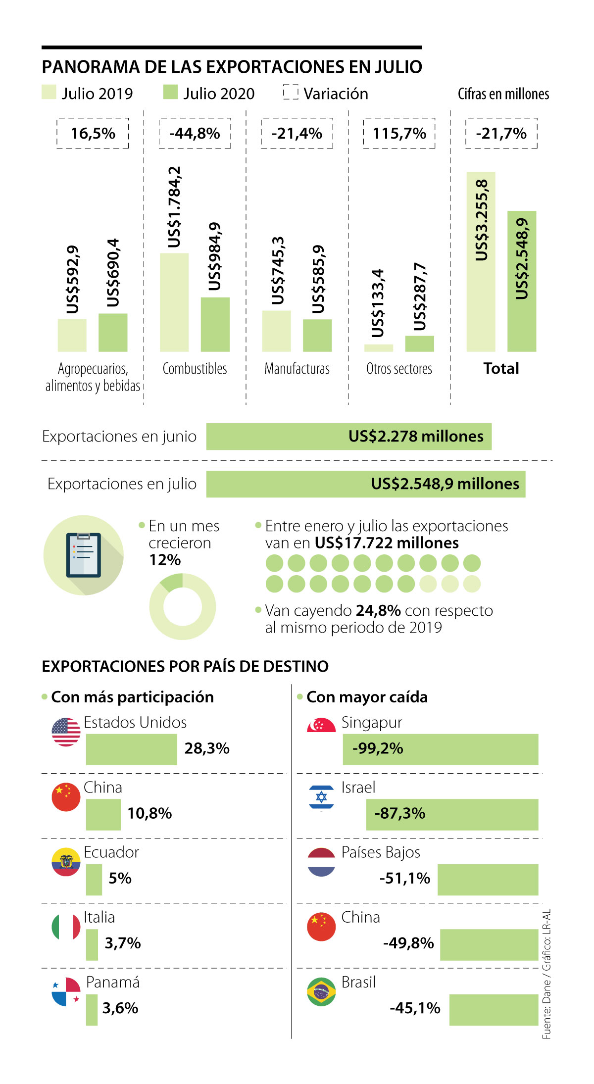 Otro de los grupos que más participa con volumen de exportación en el total es el de los combustibles. En este, el panorama es distinto, pues el crecimiento que se dio frente al mes anterior, es levemente mayor, con un crecimiento de 5%, pero respecto a julio de 2019, la reducción es notoria y llega a 44,8%.