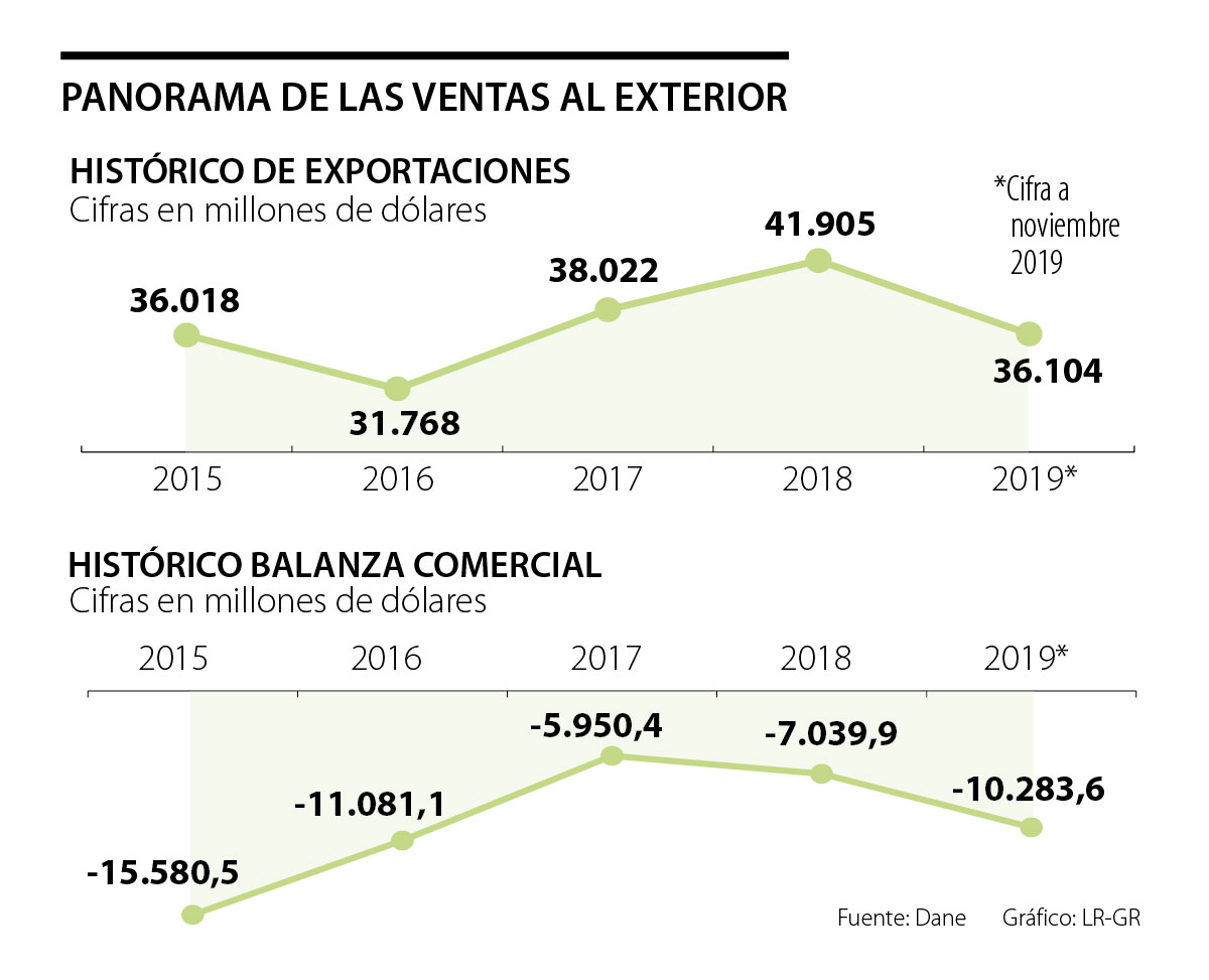 El último dato disponible da cuenta de que las exportaciones a noviembre fueron de US$36.103 millones, lo que según algunos expertos, no augura un buen resultado para el dato final de 2019, pues comparado con los 11 meses de 2018, sigue por debajo de ese techo impuesto involuntariamente.