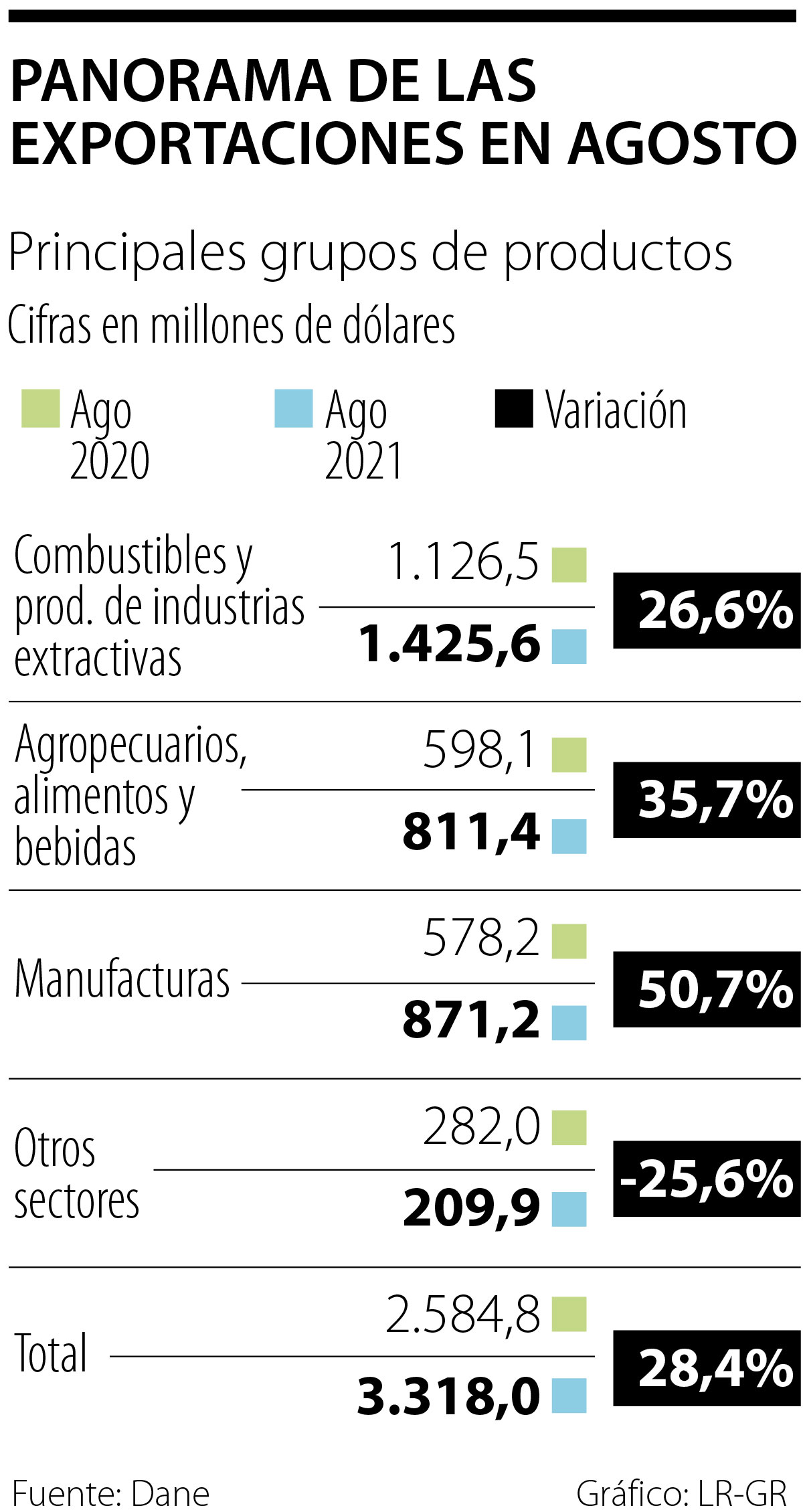 De acuerdo con los resultados que entregó ayer el Dane, las exportaciones siguen en una senda de recuperación, pues en agosto sumaron US$3.318 millones FOB; esto representó un aumento de 28,4% frente a lo registrado en el mismo mes del año pasado.