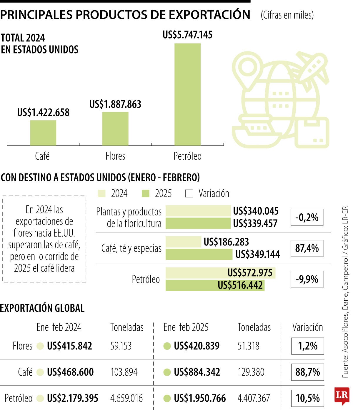 Fuera de Estados Unidos, se repite la posición preponderante del petróleo con US$1.950 millones, luego el café como producto líder del segmento agro con US$884 millones, y las flores se ubican en US$420 millones, teniendo en cuenta todos los mercados internacionales.