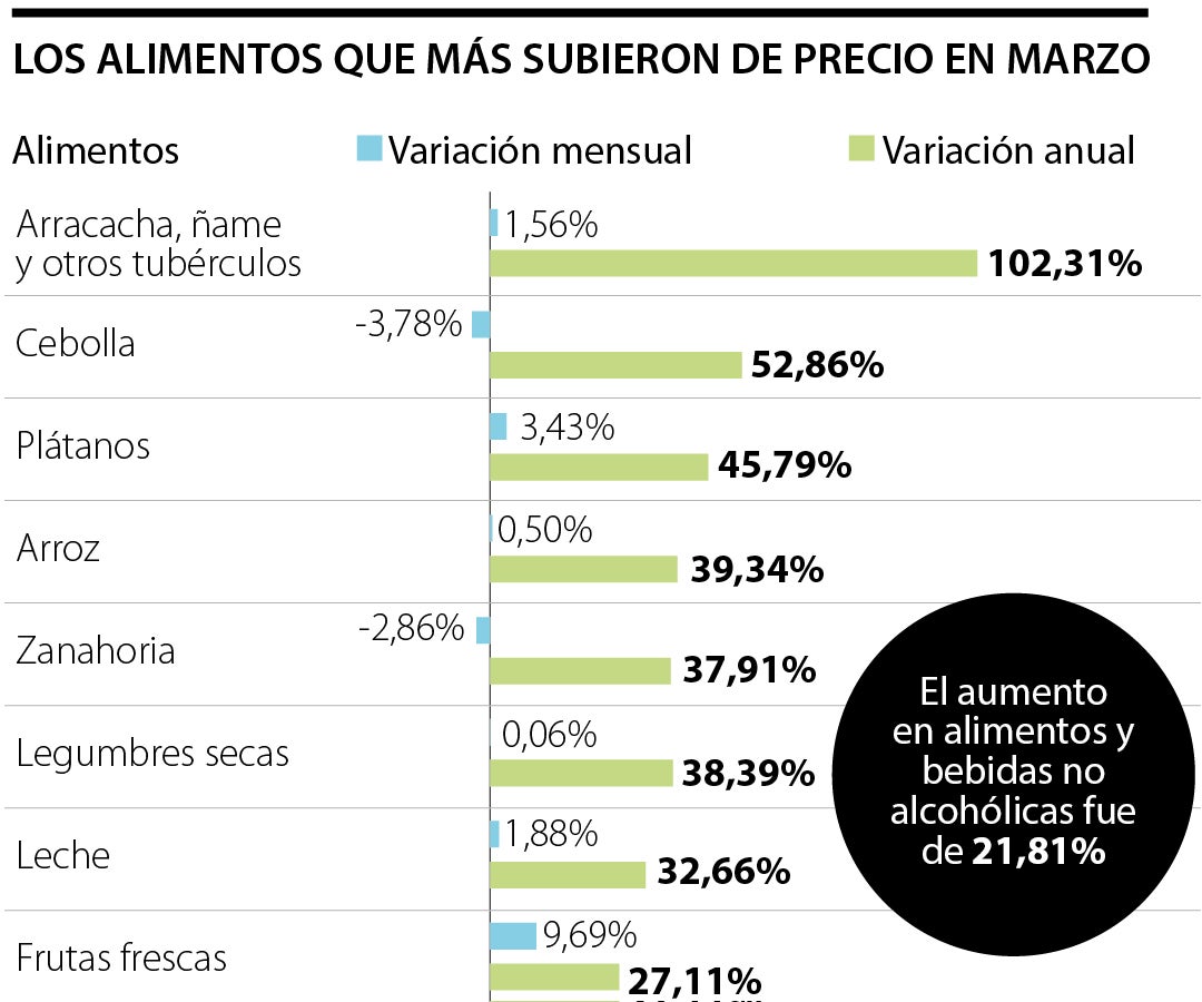 El ñame (102,31%), la cebolla (52,86%), y el plátano (45,79%) son los alimentos que presentan una mayor variación anual. El grupo de frutas frescas también estuvo entre los que más subieron, con 27,1%, con las moras. La directora del Dane, Piedad Urdinola, también destacó el aumento en los precios del mango y el limón.