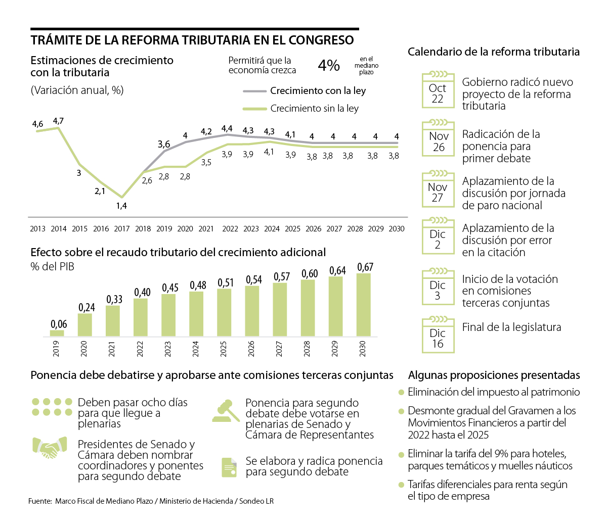 El paquete de proposiciones apunta a diferentes áreas. El senador del Partido de la U, Andrés García Zuccardi, propuso el desmonte gradual del Gravamen a los Movimientos Financieros, o 4x1.000, a partir de 2022 hasta 2025; el senador de Cambio Radical, Richard Aguilar, había incluido una proposición para que se elimine el impuesto al patrimonio; y aunque en la ponencia se aceptaron estímulos para el primer empleo, una proposición del senador del Mira, Carlos Guevara, habla de descontar los aportes al Sena, Icbf, cajas de compensación y el 10% del aporte en salud a cambio de contratar jóvenes.
