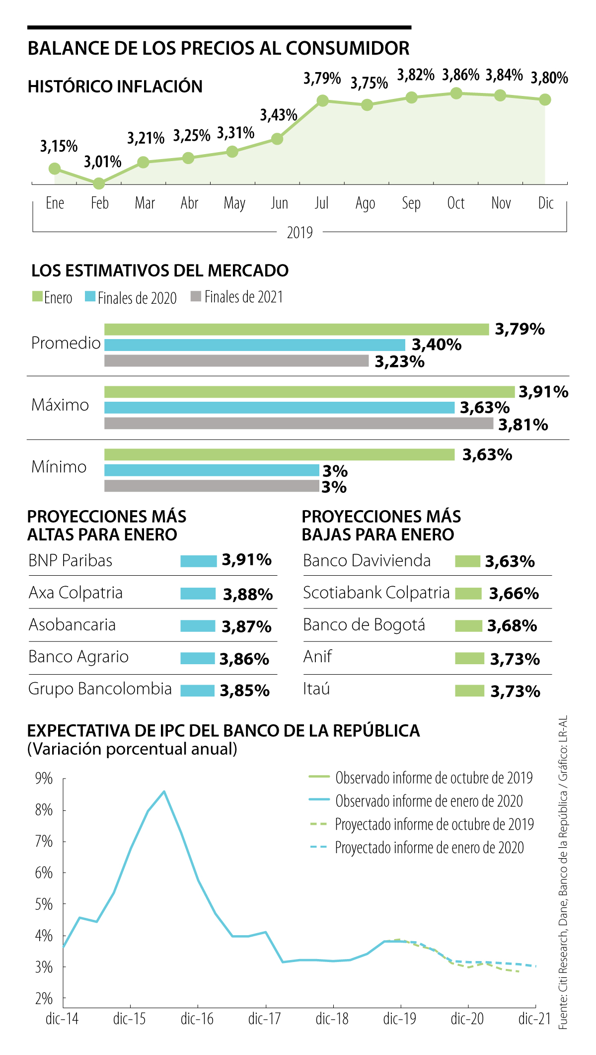 La expectativa de inflación anual para el primer mes del año fue de 3,79% y la tasa mensual mínima se fijó en 0,42%, según las estimaciones del mercado. Aunque al inicio de enero se proyectó que las heladas serían uno de los factores que le pasarían factura al precio de los alimentos, los analistas confirmaron que la variación real en el IPC se dio por cuenta del encarecimiento de los bienes y servicios, un fenómeno que, según dijeron, ocurre tradicionalmente en los primeros meses de cada año.