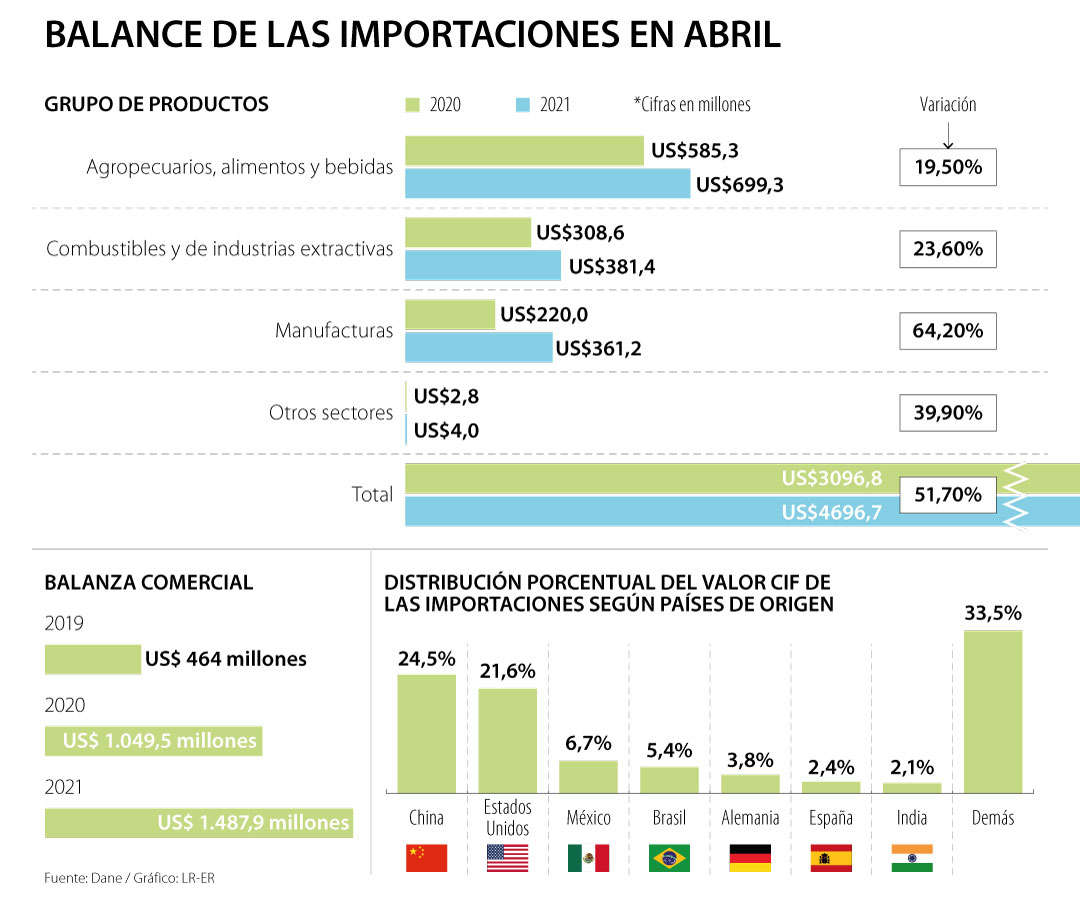 El Departamento Administrativo Nacional de Estadística (Dane) registró un aumento en las importaciones colombianas realizadas durante abril de 2021, pues en dicho mes, la actividad alcanzó US$4.696,7 millones, representando un incremento de 51,7% comparado con abril de 2020.
