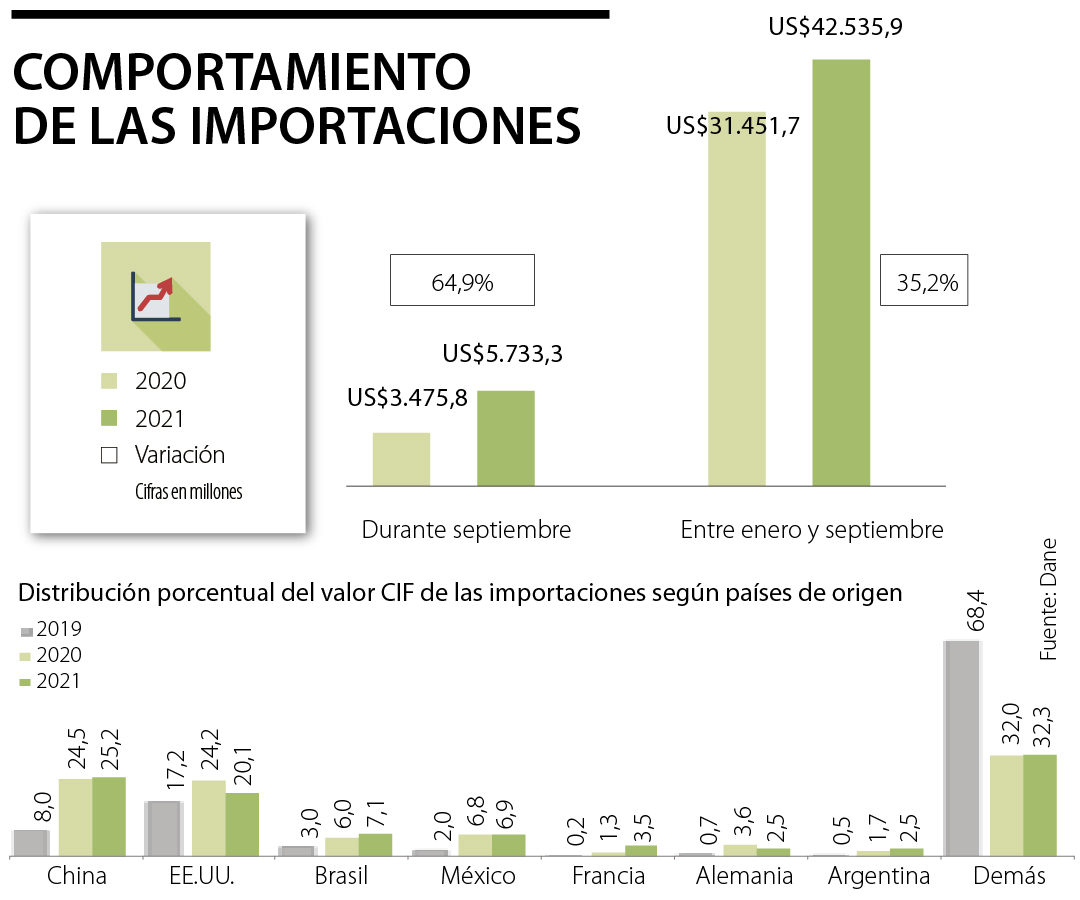 De acuerdo con el reporte mensual de importaciones del Departamento Administrativo Nacional de Estadísticas, Dane, se conoció que las importaciones en septiembre alcanzaron US$US5,733,3 millones superando al mes anterior en el que se registraron US$5.348,5 millones de valor CIFF.