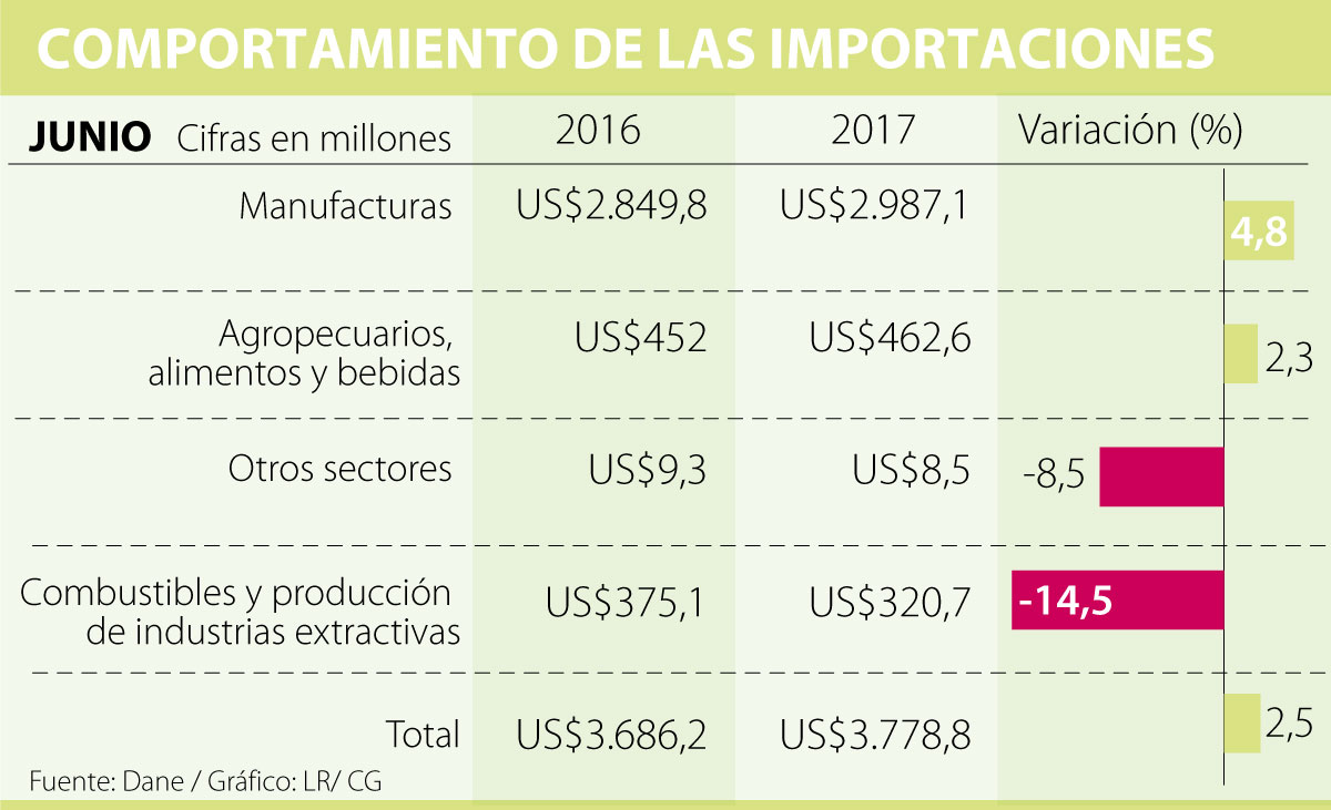 El Departamento Administrativo Nacional de Estadística (Dane) entregó el dato de importaciones con referencia a junio que mostró que el país pasó de US$3.686 millones CIF en 2016 a US$3.778 millones CIF, durante el mismo mes de este año. Una variación de 2,5%, y de los mercados con mayor participación en importaciones, se destaca el crecimiento de las compras a China en 13,7%.