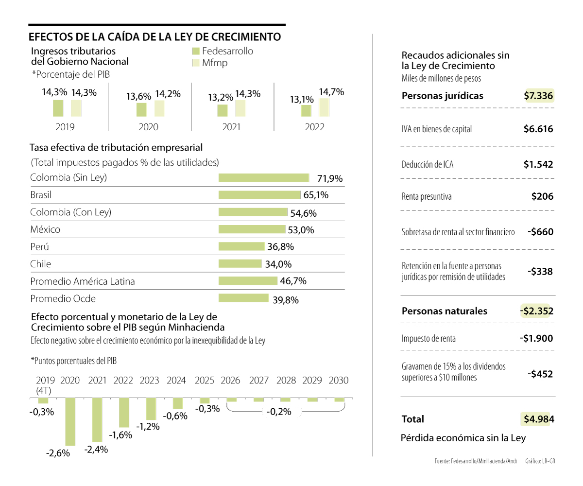 Para el Gobierno, la principal apuesta de la Ley es el crecimiento. Cálculos que incluso han respaldado gremios como la Andi, evidencian que los futuros económicos con la ley llevarían a un aumento del PIB de 4% en 2020; luego de 4,2% en 2021; y el año siguiente hasta niveles de fortalecimiento de 4,4%.