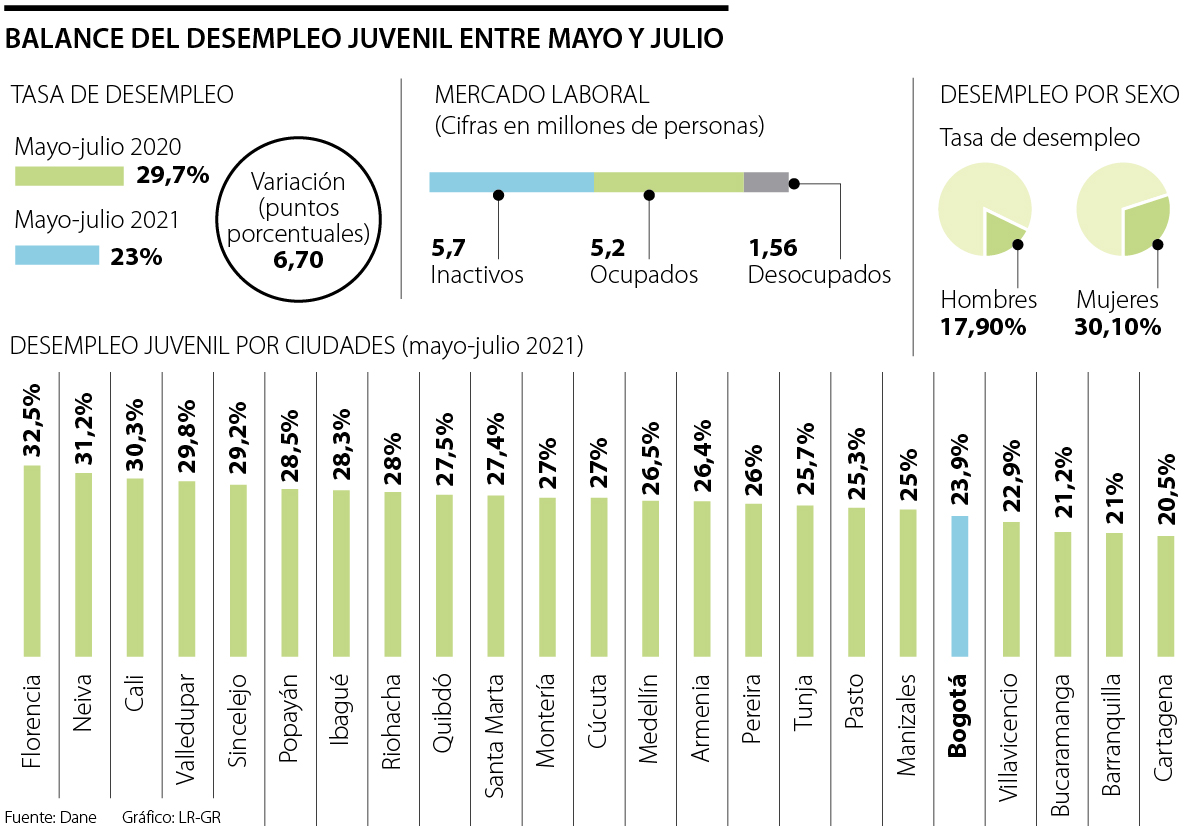 En el mercado laboral, los jóvenes han sido de los más afectados durante la pandemia. De hecho, el más reciente informe del Departamento Administrativo Nacional de Estadística (Dane), evidenció que 1,56 millones de jóvenes estuvieron desocupados en el trimestre mayo - julio, con lo que la tasa de desempleo juvenil llegó a 23%.