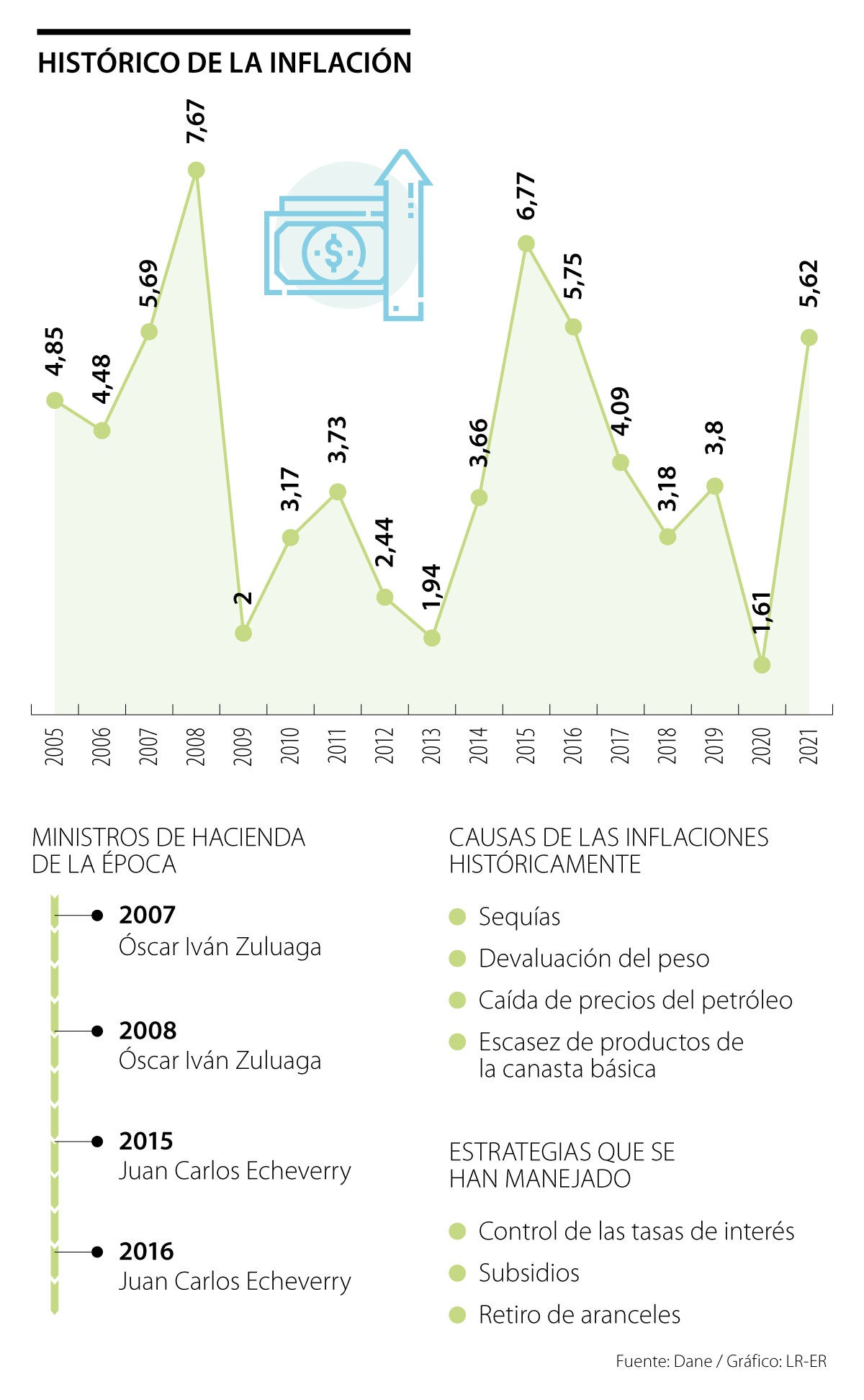 Desde el cambio de modelo, la variación ha sido menos fuerte, con picos entre 2007 y 2008, posteriormente entre 2015 y 2016, antes de la llegada de la pandemia. En 2007, la inflación cerró el año en 5,69% y en 2008 llegó a 7,67%. En ese momento, el alza se debió a la subida en los precios del petróleo que impulsó el precio de los combustibles y se sumó a los altos precios de los alimentos. Por su parte, en 2015 hubo factores como el fenómeno del Niño que produjo escasez en los alimentos. Esto se sumó a otros factores como la subida en la TRM y un alza en las expectativas.
