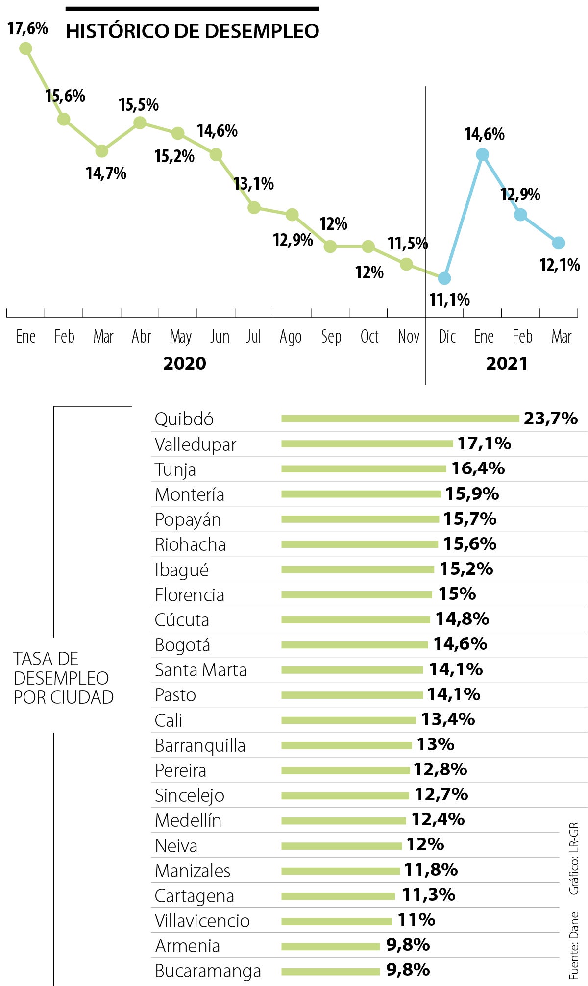 El desempleo se redujo 2,6 puntos porcentuales en marzo al alcanzar una tasa de 12,1%; también se registró una reducción mensual