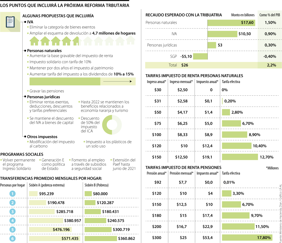 Los cambios en la estructura tributaria se enfocarán en tres puntos: IVA, con el que se espera recaudar $10,5 billones, impuestos a las personas naturales ($17,6 billones) y gravámenes a las personas jurídicas, ($3 billones), mencionando que $5,1 billones se entregarán a través del Sistema General de Participaciones.
