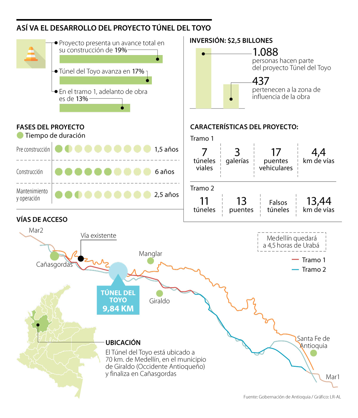 El desarrollo del proyecto del Túnel del Toyo avanza a buen ritmo. Un año después de iniciar su construcción, la Gobernación de Antioquia detalló ayer que el Túnel completa un avance de 17% mientras que las obras en general van en 19%. Aunque desde el despacho gubernamental aseguran que todo podría estar listo a finales de 2023, piden al Gobierno Nacional que agilice los trámites para la adjudicación del tramo 2, una de las dos partes que componen toda la infraestructura.