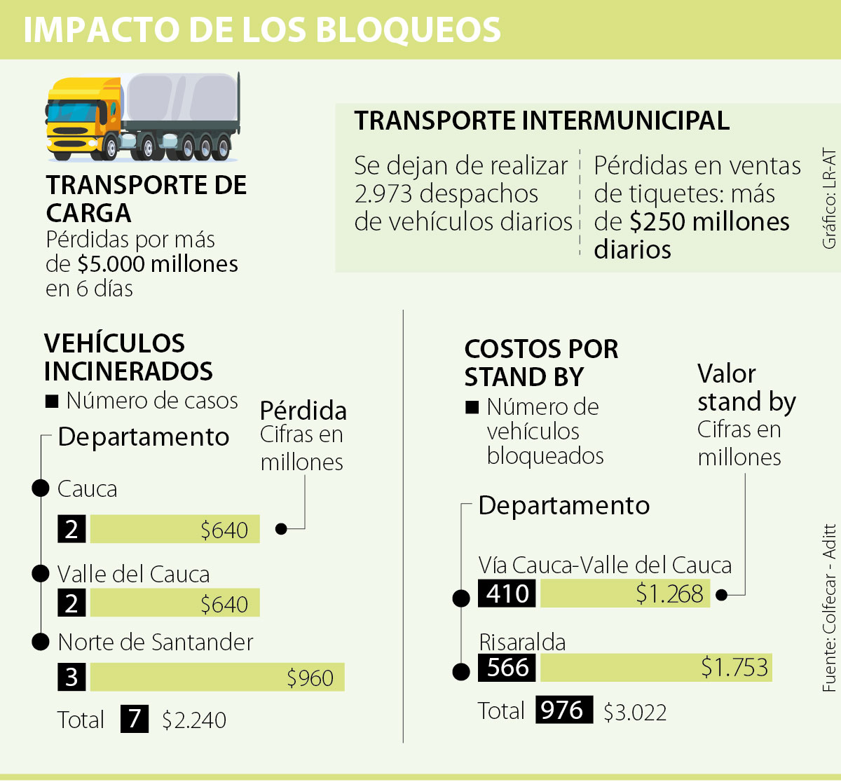 A esto se suman los costos stand by, es decir, lo que se deja de percibir cuando un vehículo está parado. Según Colfecar, la cifra llegó a $3.022 millones si se tienen en cuenta los bloqueos en la vía Cauca-Valle del Cauca y en Risaralda que afectan a 976 vehículos. De acuerdo con Juan Carlos Rodríguez, presidente ejecutivo del gremio, se pierden aproximadamente $600 millones diarios por cuenta de los bloqueos.