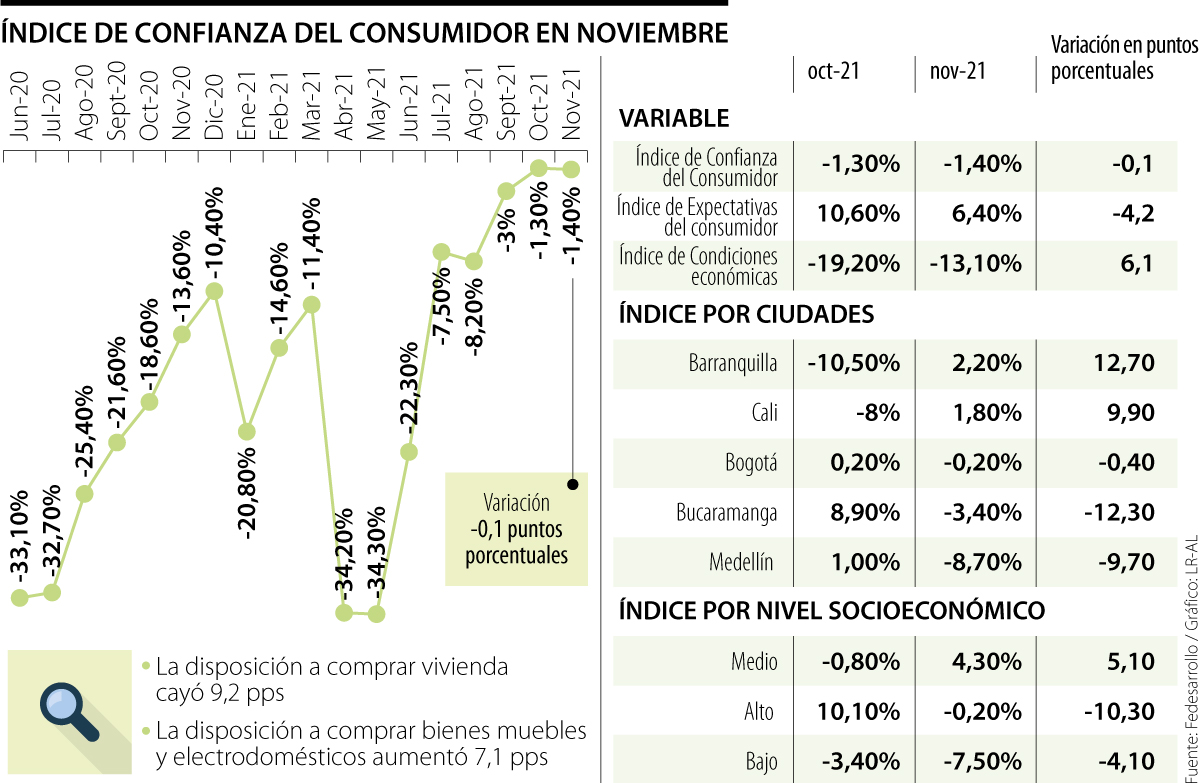Aunque los consumidores colombianos venían aumentando su optimismo en los últimos meses, el Índice de Confianza del Consumidor (ICC) de Fedesarrollo registró un leve retroceso en noviembre, cuando la cifra llegó a -1,4%.