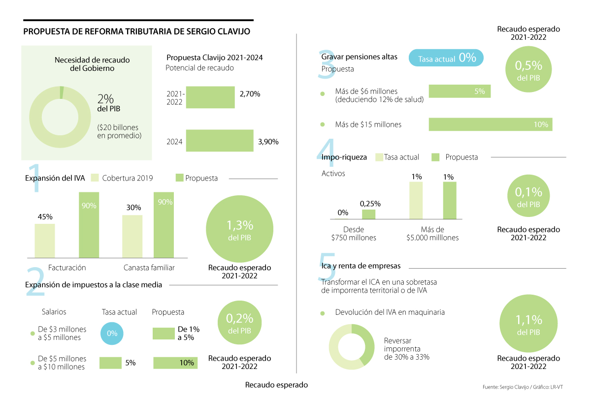 En esta ocasión, el economista Sergio Clavijo, expresidente de la Asociación Nacional de Instituciones Financieras (Anif) y actual docente de la Universidad de los Andes, planteó un paquete fiscal estructural que aumentaría el recaudo en 2,7% del PIB para 2021-2022, y en 3,9% entre 2021 y 2024, es decir, superaría las falencias actuales del Gobierno.