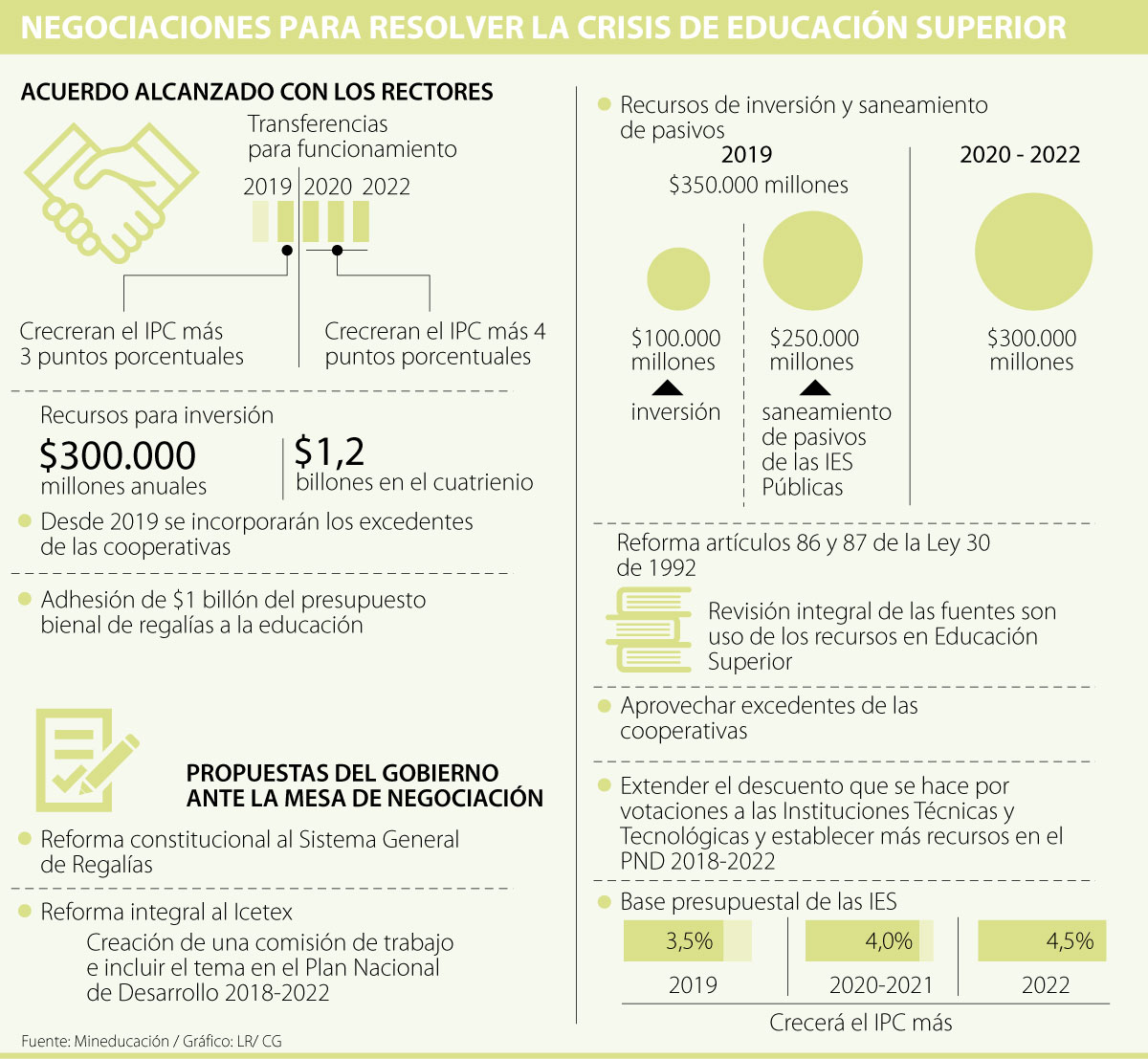 La semana pasada el ministerio propuso que para 2019 se destinen $250.000 millones del Presupuesto General para saneamiento de pasivos de las Instituciones de Educación Superior Públicas y $100.000 millones para inversión, uno de los puntos sobre los cuales aún no hay acuerdo.