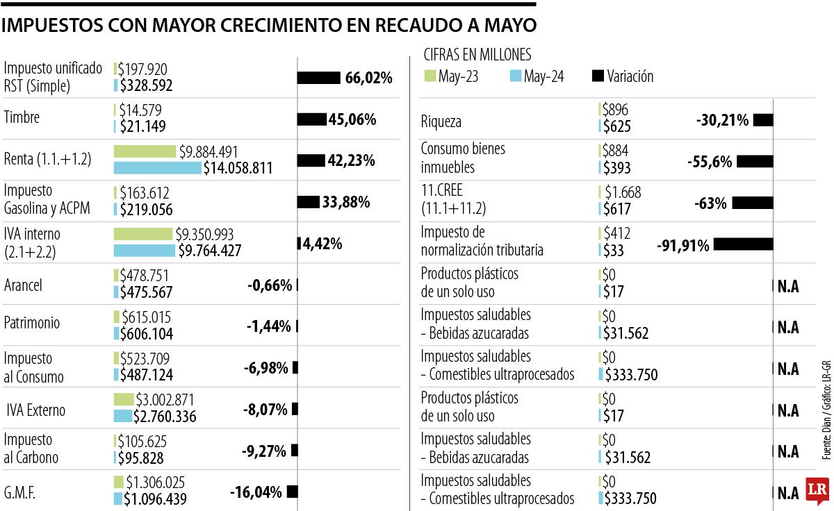 Impuestos de mayor crecimiento en recaudo con corte a mayo