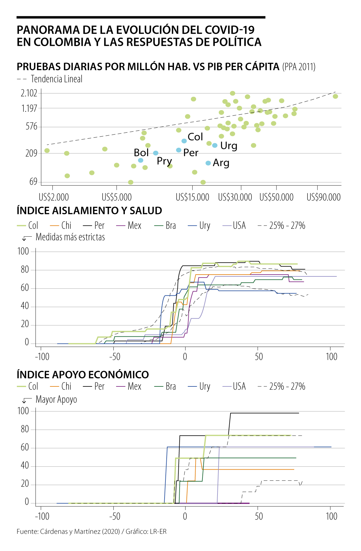 No obstante, las medidas de aislamiento decretadas, y el apoyo económico de las instituciones son dos puntos en los que ya hay un terreno ganado. Según el informe, Colombia está por encima de casi todos los países de la región en relación a los estos dos puntos, y solo es superado por Perú en la magnitud de apoyo económico que se ha dado a la crisis.