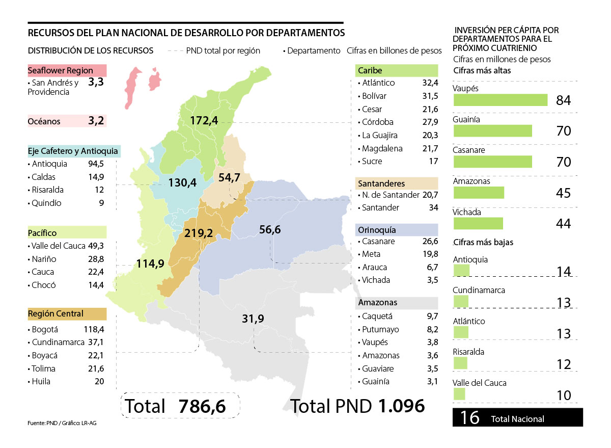 Sin embargo, la inversión per cápita del Plan es bastante diferente pues mientras los departamentos con más recursos por habitante son Vaupés, Guainía y Casanare, con $83,70 millones, $70,20 millones y $69,70 millones, respectivamente; los que recibirán menos por persona serán Valle del Cauca ($10,2 millones), Risaralda ($12,3 millones) y Atlántico ($12,5 millones).