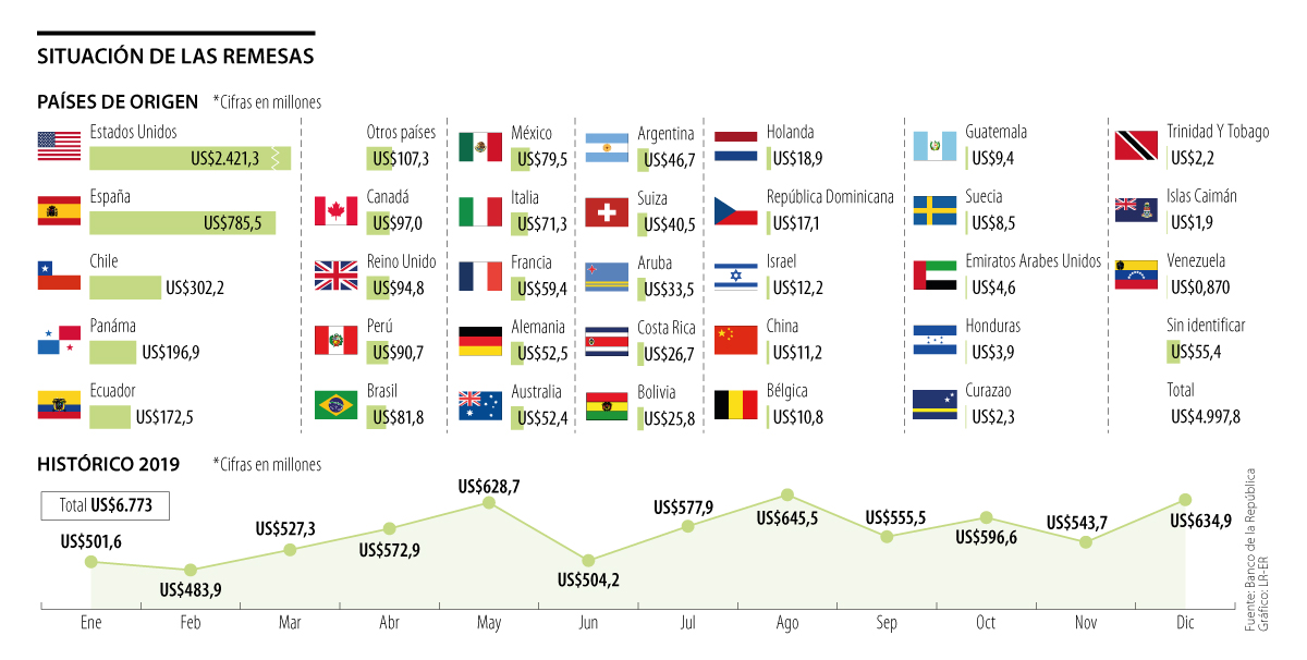 Aunque el Banco de la República hizo el seguimiento al reporte en el que las remesas alcanzaron US$6.773 millones, hay que tener en cuenta que al filtrar los datos por país de origen, solo aparecen con corte al tercer trimestre de 2019. Teniendo en cuenta eso, resalta que las naciones nombradas hoy son las principales fuentes de ingresos. En el caso de la Unión Americana, esta pesa 49% de los dineros que llegan del extranjero, superando US$2.400 millones en los primeros nueve meses de 2019, (y se proyecta que el consolidado sería cercano a US$2.800 millones); mientras que España aparece con 16% de la tajada de los recursos, con cifras que superaron US$787 millones.