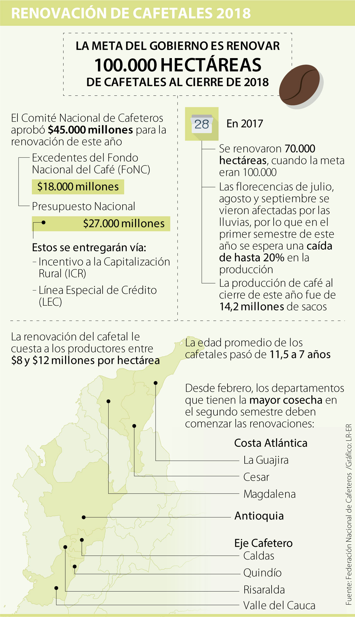 Con el fin de permitirle a los cafeteros planificar con tiempo las renovaciones de cafetales, el Comité Nacional de Cafeteros anunció a finales del año pasado los recursos aprobados para apoyar el proceso en 2018.