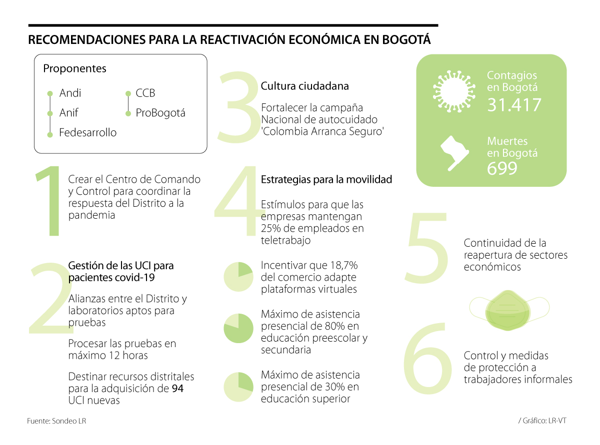 La Asociación Nacional de Empresarios (Andi), la Asociación Nacional de Instituciones Financieras (Anif), la Cámara de Comercio de Bogotá (CCB), Fedesarrollo y ProBogotá le enviaron a la alcaldesa de la capital, Claudia López, una serie de propuestas con las que los empresarios creen que la ciudad recuperará su dinamismo económico, sin descuidar las medidas de protección para evitar casos de contagio. Los firmantes exponen seis líneas de acción para abarcar la crisis.
